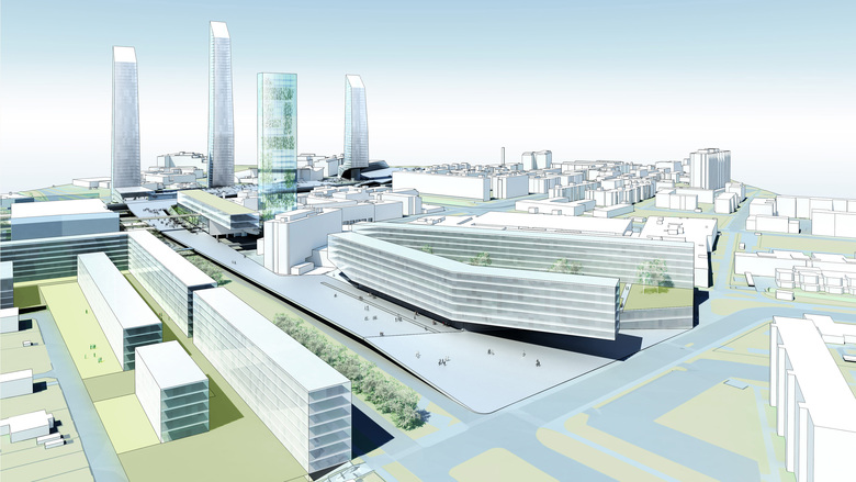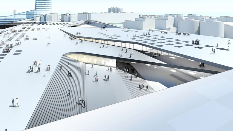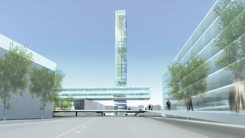Die betreffenden Baugebiete liegen in einem heterogenen Stadtbild. Das Infrastruktur-Konzept des Entwurfs verbindet diese durch eine neue Rad- und Fußgängerebene, die alle bestehenden infrastrukturellen Barrieren überbrückt, indem sie an das bestehende Rad- und Fußgängerwegenetz anknüpft und die umgebenden Stadtteile direkt miteinander verbindet. Diese neue öffentliche Verbindungsebene wird für optimale Transparenz und Durchlässigkeit mit Lichtöffnungen perforiert und von den bestehenden Bäumen durchbrochen.