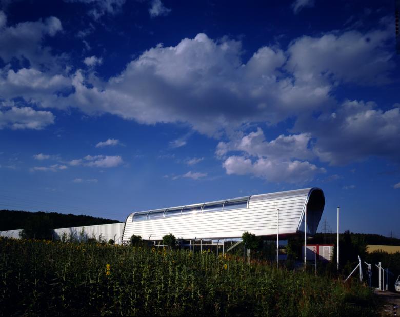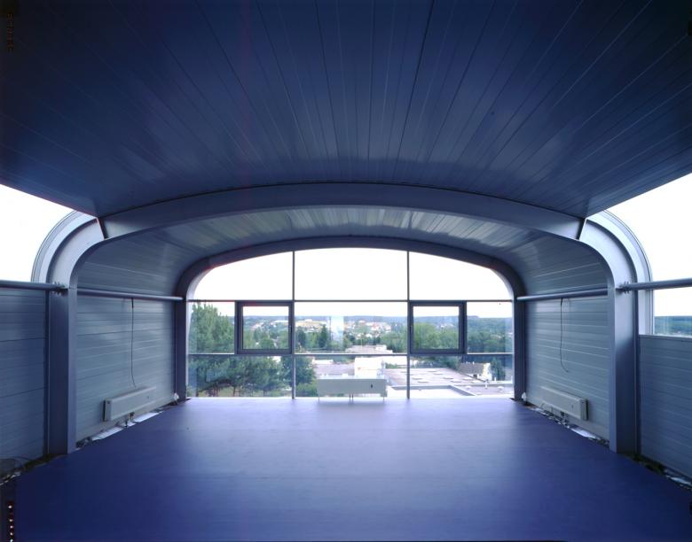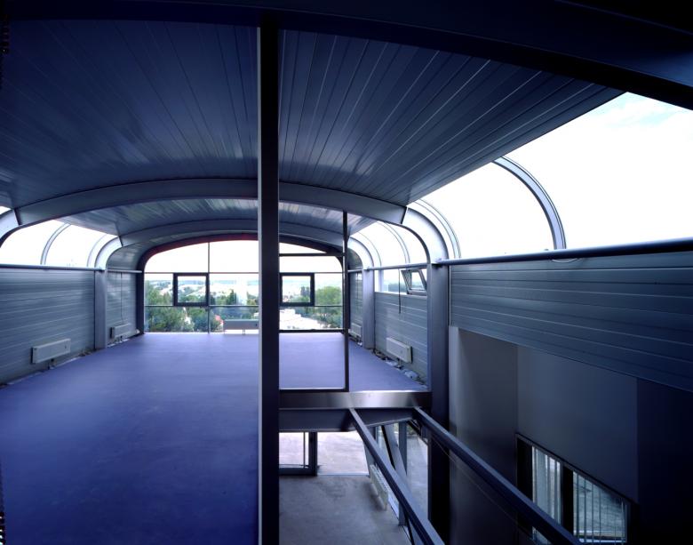 Das Konstruktionsskelett besteht aus vier gebogenen Stahlrahmen, ausgesteift durch einen A-förmigen Bock. Das Erdgeschoß ist mit Glas ummantelt und nimmt die Umgebung in den Innenraum hinein. Das Obergeschoß ist mit wärmegedämmten Metallkassetten aus Aluminium und gebogenen Glasbändern eingehüllt. Die Stirnflächen der Röhre sind vollflächig verglast. Ein großzügiger Luftraum mit der freistehenden Metalltreppe aus dem Flugzeugbau verbindet das Erdgeschoß mit dem Obergeschoß – einem Büro- und Besprechungsraum mit Nasszelle und Kochnische.