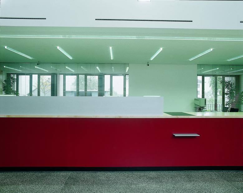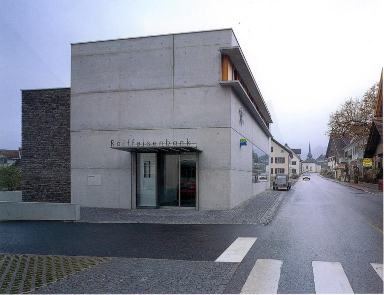 Das überraschend Janusköpfige dieses Hauses, das in der Dorfmitte von Satteins auf urbane Weise Geschäfts- und Wohnzwecke verbindet, drückt sich baukörperlich aus: Glätte und Rauigkeit, Flächigkeit und Tiefe, Transparenz und Abschluss. Zur Straße im Erdgeschoss die Bankhalle mit aufgesetzten Wohnungen, an der Seite die Eingänge zu Bank und Wohnungen, zum Garten und zum Tal eine aufgelöste Fassade. Der Entwurf setzt offenbar auf Gegensätze: zwischen den Materialien (glatter Sichtbeton an der Straßenfront, an den gartenseitig vorgebauten Sonnenschutz- und Aussichtsveranden, scharf gefasstes Glas und grauer Naturstein am Mittelbau, feingliedriges Holz am Nebenbau), zwischen Raumschichten (verschieden hohe Bereiche der Kundenhalle; Niveauunterschiede zwischen abgesenktem Garten und Straße). Ein Werk, das in seiner unmittelbaren Materialität und Körperlichkeit eher an Architekturen der Tessiner „tendenza“ erinnert, denn an das Baukünstlertum. Somit: eine Andeutung einer Entwicklungslinie für die Vorarlberger Architektur, und wohl die bisher reifste Realisierung von G & H.