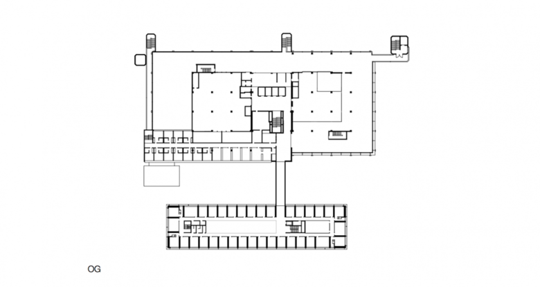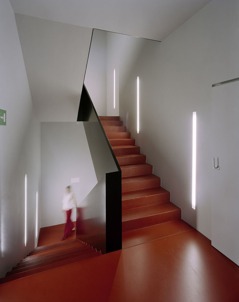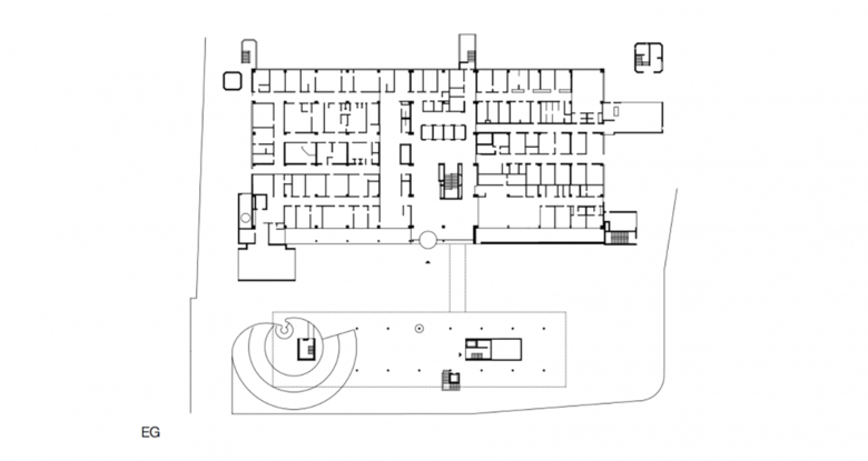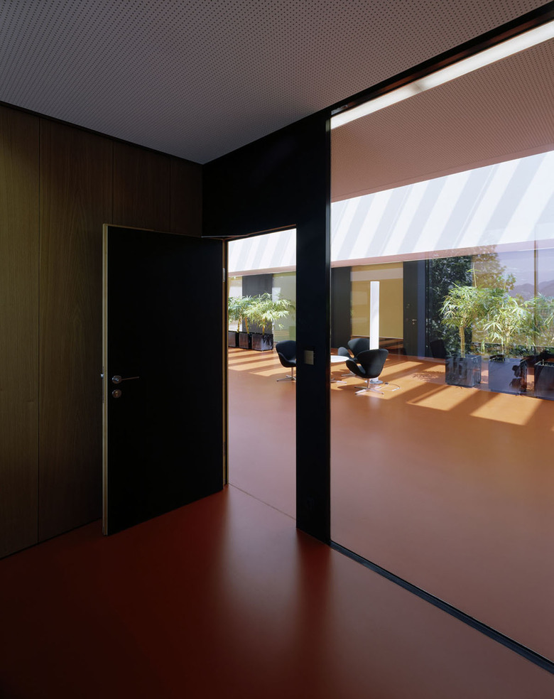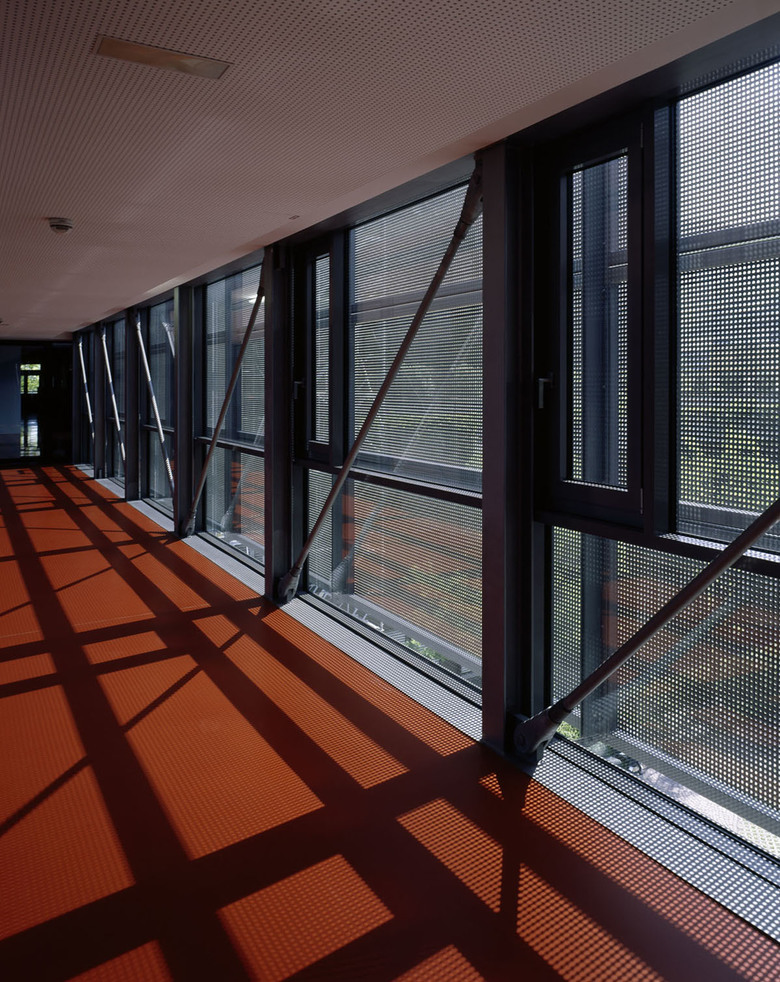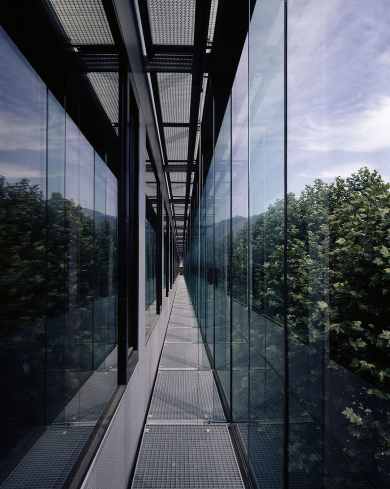 Die Dornbirner Westeinfahrt trifft beim Krankenhaus auf die zentrale Stadtstrasse: das Spital ist ein Signalbau, abgerückt von der Lustenauer Straße stehend. Das Vorfeld wird nun für den Zubau eines Verwaltungstrakts genutzt. Der in Stahl konstruierte, mit Stahlbetonkernen ausgesteifte, hoch aufgeständerte Riegel steht parallel zum Haupthaus. Der Stützenraster der Tiefgarage wird übernommen. Die Büros gruppieren sich um eine zweigeschossige Halle. Die Glas-Metall-Fassade weist einen außen liegenden Sonnenschutz auf. Der Bestand wird umstrukturiert und in Weiterführung des Sockelgeschosses eine Intensivstation, Bereitschaftszimmer und die Ambulante Bettenstation ergänzt.