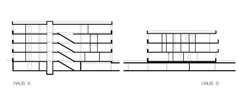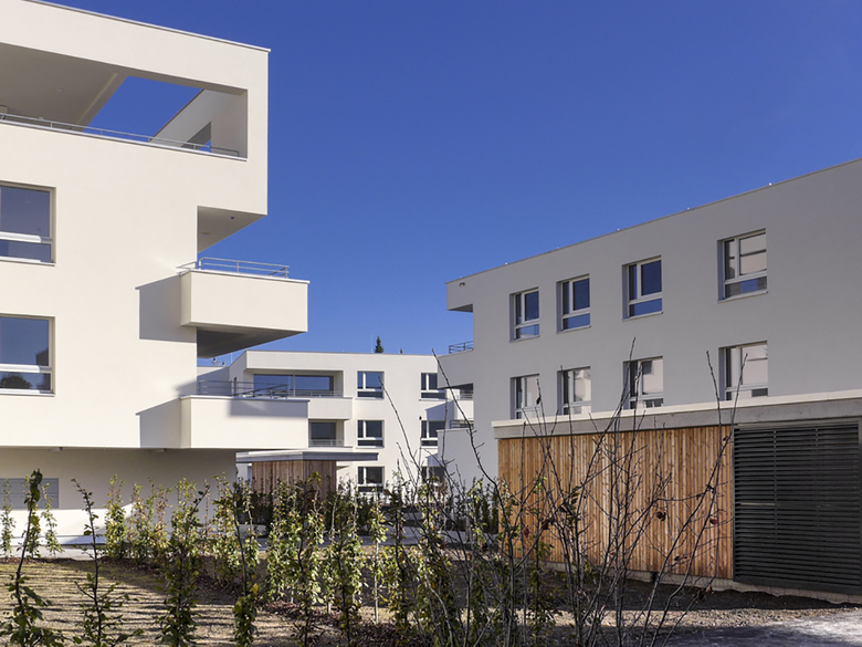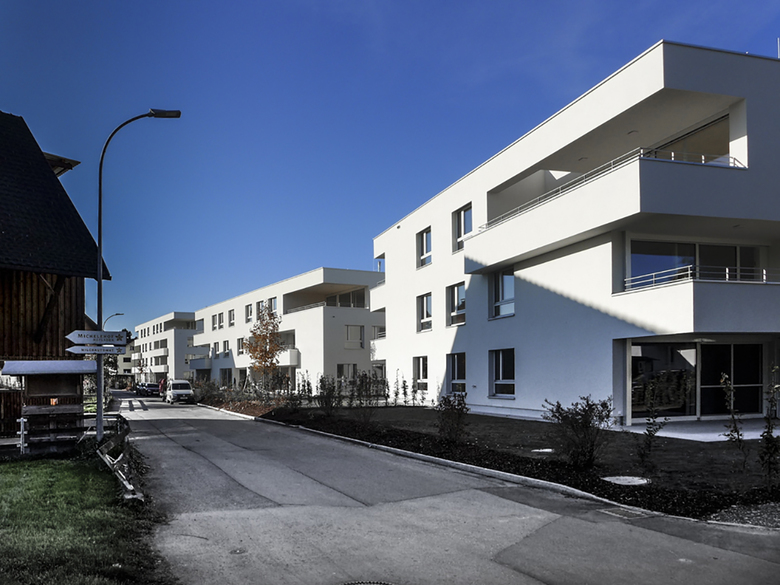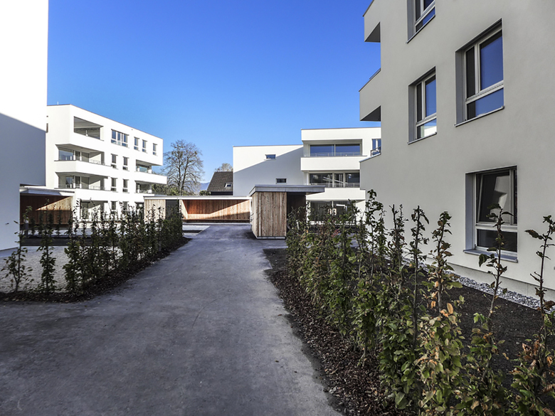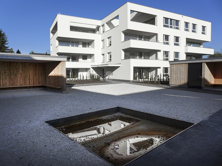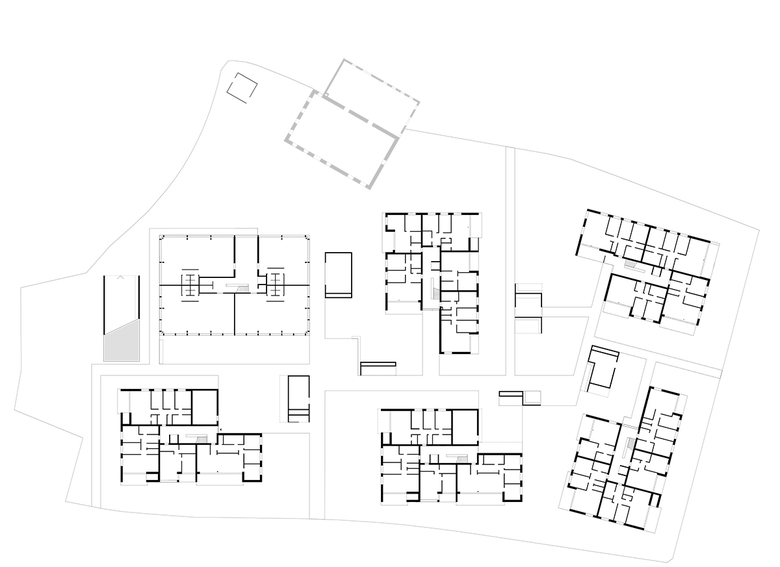 Fünf Wohnhäuser mit jeweils einer „fehlenden Ecke“ im rechteckigen Grundriss stehen verdreht zueinander am Grundstück, was nicht nur mit einer daraus resultierenden räumlichen Vielfalt, sondern auch mit dem Bezug zur dicht bebauten Umgebung des Harder Zentrums zu tun hat. Die Wohnungsgrundrisse sind entsprechend unterschiedlich und komplex, denn für jede Wohnung gelten andere Voraussetzungen. In einem sechsten Haus über dem vollständigen Rechteck sind gewerbliche Firmen und Dienstleister untergebracht, es dient als Vermittler zwischen „drinnen“ und „draußen“ und hält diese Grenze beweglich. Zugleich beginnt hier eine Abfolge von öffentlichen, halböffentlichen und privaten Räumen, Wegen, Höfen und Nischen – ein Dorf am Bach.