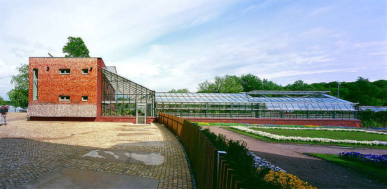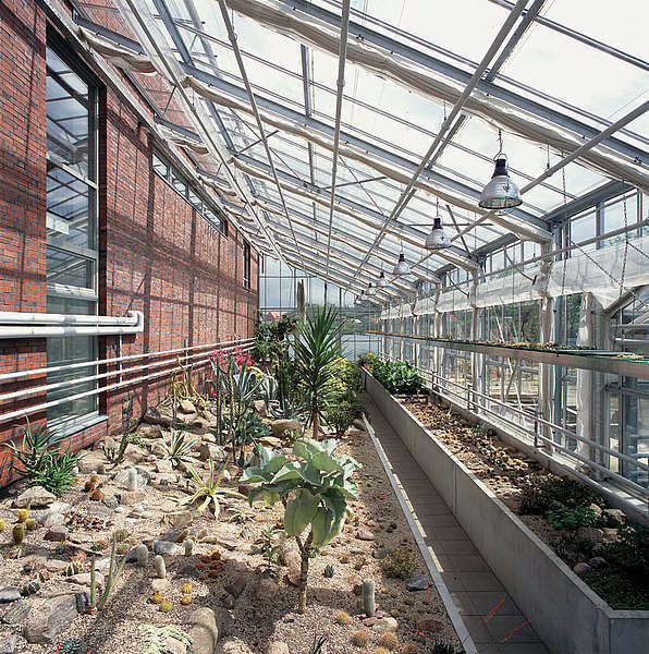 Der Bau erhält eine Lärchenholz-Schindelfassade mit einem Torfbrandklinkersockel. Die Gewächshäuser sind als Stahl-Glas-Konstruktion ausgeführt. Das Dach wird als extensives Gründach mit einer Solaranlage geplant.