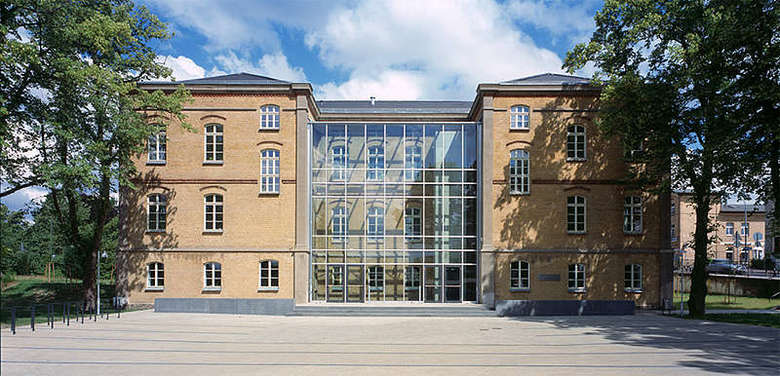Straßenseitig wird das Gebäude über die zwei historischen Eingangsbereiche im Erdgeschoss erschlossen. Die klare Gliederung führt den Besucher vorbei an den verschiedenen Schulungsräumen in das zentrale Forum, das sich nach Süden öffnet und mittels einer vorgeschalteten Galerie den Austritt in den Wintergarten ermöglicht.