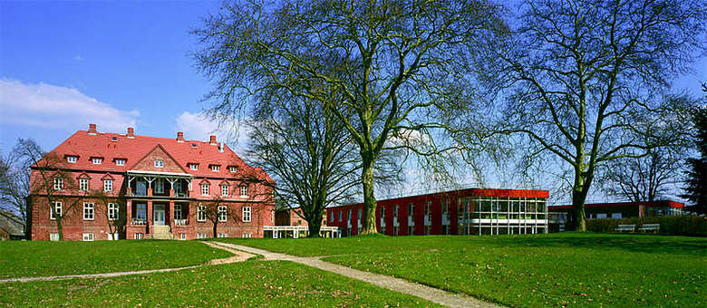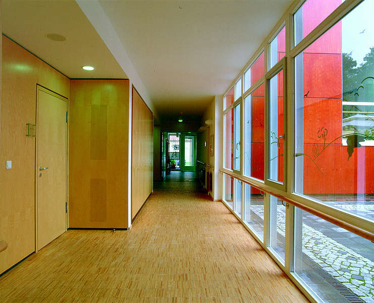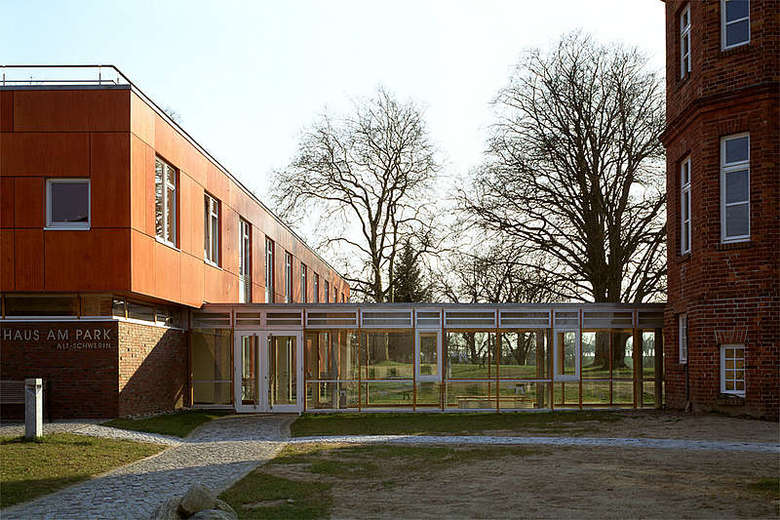 Die Anlage des Pflegeheimes bildet ein spannungsvolles Ensemble aus Alt- und Neubau. Die Sichtachsen des denkmalgeschützten Herrenhauses werden freigehalten, der Neubau ordnet sich dem haupthaus unter und wird so Teil der Parklandschaft am See. Die funktionale Qualität der Anlage wird durch die klare Trennung von Pflegebetrieb im Neubau und den gemeinschaftlichen Nutzungen im Altbau gebildet. Der zweigeschossige Neubau wird in Verbindung mit der Fassadengestaltung aus rot lasierten Birkenholztafeln und Torfbrandklinkern zu einem zurückhaltenden Erscheinungsbild. Durch die Aufweitung des Innenhofes wird eine optimale Durchsonnung der Zimmer erreicht. Es entstehen spannungsvolle Aussen- und Innenräume. Die Zimmer erhalten raumhohe, französische Holzfenster, die allen Bewohnern den direkten Blick auf Park und See ermöglichen. Am Kopf der Gebäudeflügel liegen auf jeder Etage großzügig verglaste Aufenthaltsräume mit Kochgelegenheit und Terrasse. Das dreigeschossige rote Ziegelgebäude, das alte Herrenhaus mit seinem mächtigen Walmdach, bildet den Mittelpunkt des Ensembles und ist über einen filigranen Glasgang mit dem Pflegeheim verbunden.