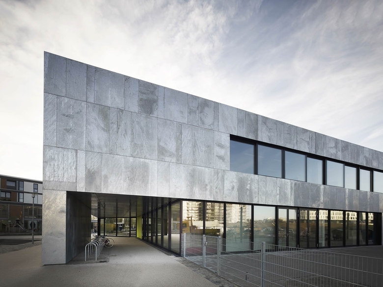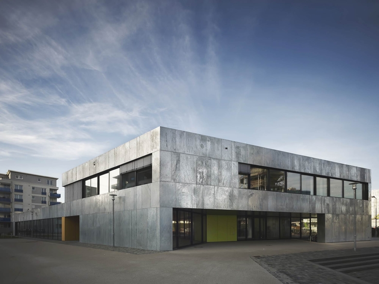 Das Gebäude wurde in zwei Bauabschnitten realisiert. Der erste Bauabschnitt (mit Unterstützung von Wenzel + Wenzel, Lph. 8) ist um eine zentrale Erschließungshalle organisiert, während der zweite Bauabschnitt (in Zusammenarbeit mit Bau4, Lph. 4-9) einen geschützt liegenden Innenhof umschließt. Zwei Räume, ein Innen- und ein Außenraum, die für die Gemeinschaft der Schule eine große Qualität darstellen.