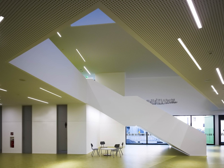 Das zweigeschossige Foyer wird zur lebendigen Mitte der Schule mit vielfältigen Nutzungsmöglichkeiten. Das Foyer ist Treffpunkt für Schüler und Lehrer in den Pausen, aber auch repräsentativer Ort für Veranstaltungen (Vorträge, Feierstunden etc.). Sowohl der Speiseraum mit angrenzender Küche zu Bewirtungszwecken als auch der Mehrzweckraum, bzw. der Aufenthaltsraum können dem Foyer zugeschaltet werden.