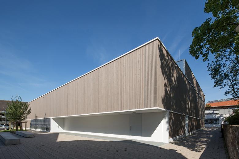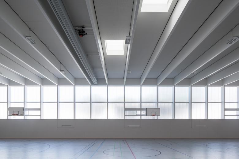 Das Engelbert-Kaempfer-Gymnasium (EKG), eine Schule mit mehr als 400 Jahren Tradition, besteht baulich aus dem Lippehof mit Vorwerk und Marstall, einer ehemals fürstlichen Residenz aus dem 18. Jahrhundert, dem Klassentrakt aus dem Jahr 1974 und einem Neubau in Holzbauweise aus dem Jahr 1995. Der Neubau der Zweifachsporthalle ist in der Logik der Hauptgebäude als möglichst kompakter Baukörper mit klar ablesbarer Geometrie konzipiert. Die sehr kompakte, zweigeschossige Gebäudeorganisation ermöglicht zwischen der Sporthalle und dem Klassentrakt einen größtmöglichen Abstand und die Ausbildung eines großen, nutzbaren Schulhofs mit Sitzgelegenheiten. Das klare Ordnungskonzept schafft in der kompakten Gesamtform eigenständige Bereiche und eine eindeutige Orientierung: Der Hauptzugang zur Sporthalle erfolgt von Süden vom Schulhof über einen gestalterisch betonten Gebäudeeinschnitt. Dieser Einschnitt lenkt die von Osten kommenden Schüler direkt zum Eingang, ist Witterungsschutz und erste “Schmutzschleuse”. Das zentrale Foyer wird zum Mittelpunkt der Sporthalle. Von hier sind auf kürzestem Weg alle Bereiche zu erreichen. Beim Betreten erlebt der Nutzer einen zweigeschossigen Raum und kann von der Galerie im Obergeschoss sowohl den Eingangsbereich des Foyes als auch die beiden Sportflächen überblicken. Die 7m hohe, teilbare Zweifachspielfläche wird zweiseitig belichtet: von Norden über eine große, transluzente Fläche oberhalb der Prallwandzone und im Süden über eine kleinere lichtstreuende Fläche auf Höhe der Brettschichtholzträger. Die äußere Fassadenschicht wird durch eine sägerauhe, vorvergraute Lärchenholzschalung gebildet. Die konstruktiv notwendige, horizontale Abdeckung als auch die Sockelausbildung erfolgt durch weißgraue Metallwinkel und ist gleichzeitig gestalterisch gliederndes Element. In konsequenter Fortführung der äußeren Erscheinung sind auch die Innenräume in Weiß und Grau gestaltet. Die Sporthalle ist im Passivhausstandard errichtet. Die großen unverschatteten Dachflächen werden als Aufstellfläche einer Photovoltaikanlage genutzt.