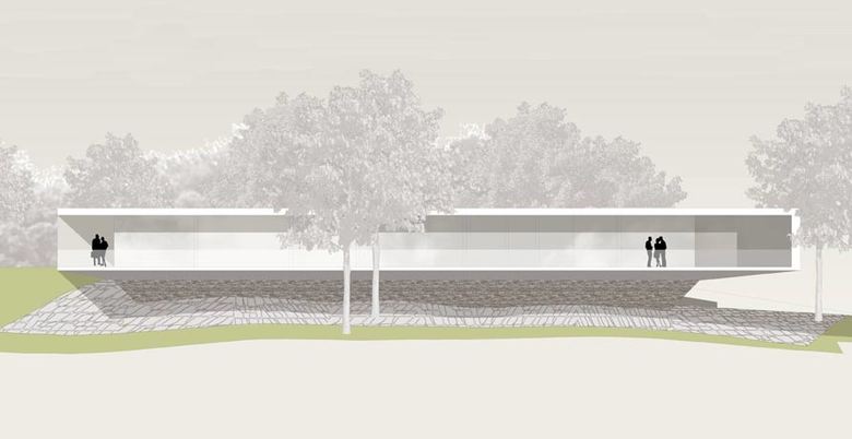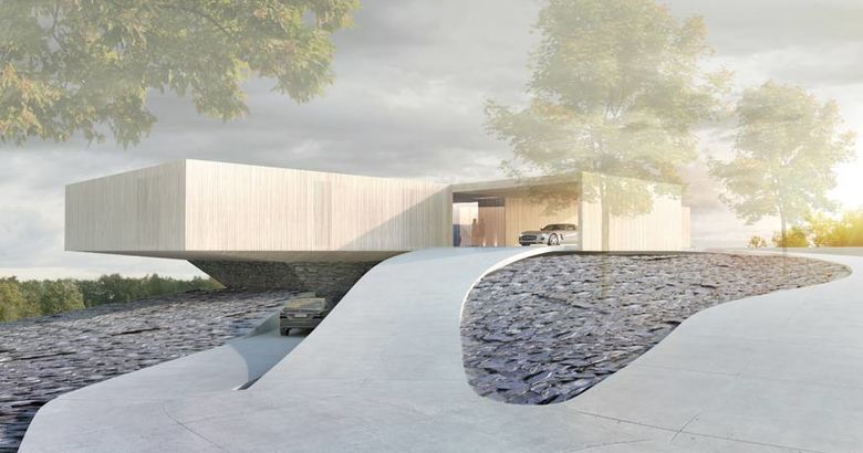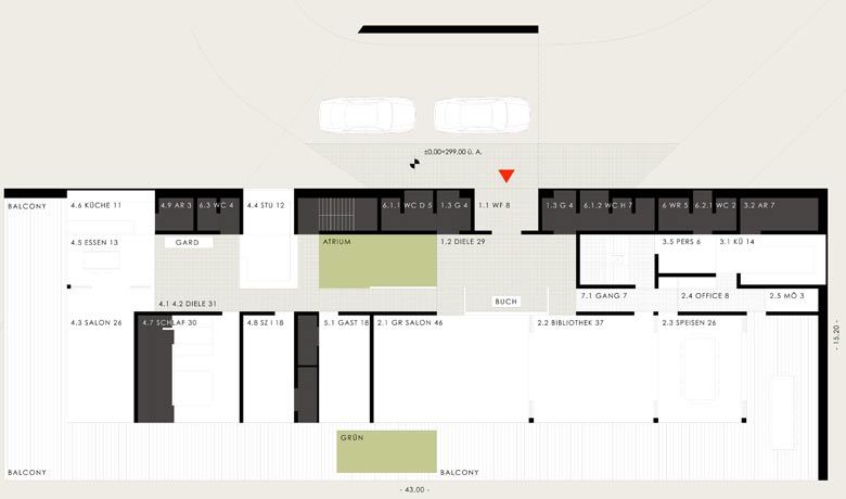Auf der Spitze der Liegenschaft platziert, erhebt sich ein langgestreckter, schlichter, quaderförmiger Baukörper über einem aus Schieferstein errichteten Sockelgeschoß. Das Objekt schwebt über dem nach Süden hin abfallenden Gelände. Vorfahrt und Empfang sind großzügig gestaltet und ermöglichen einfache Orientierung. Die Vorfahrt weitet den Straßenraum im Bereich des Wendehammers auf und gewährleistet somit die Sicht auf den Wald auch für die Anrainer. Die Nachbargebäude werden kaum überragt, repräsentative Qualitäten eröffnen sich nach und nach wenn man sich dem Gebäude nähert. Zum angrenzenden Wald orientieren sich uneinsehbare private Terrassen und Freiflächen.
