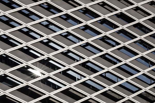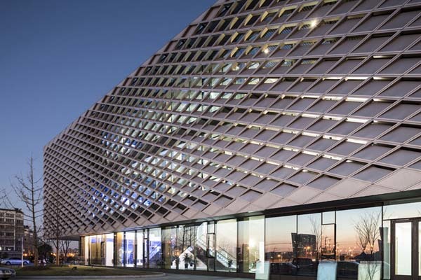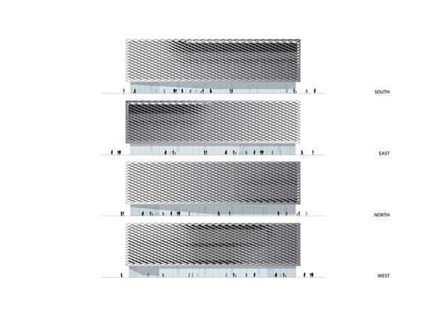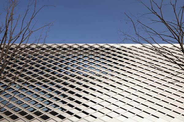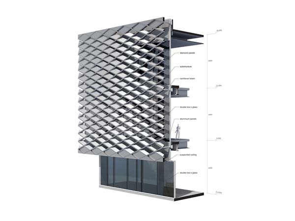 Dieses rautenförmige Diagridmuster kann mit sieben verschiedenen Paneelen, die einen Öffnungsgrad von 9-60% zulassen, bestückt werden und so die Sonneneinstrahlung entsprechend des dahinterliegenden Programms in feinen Abstufungen regulieren. Während Ausstellungsräume durch eine nahezu geschlossene Fassade mit minimalen Öffnungen gekennzeichnet sind, erhalten Büros den maximalen Grad an natürlichem Tageslicht.