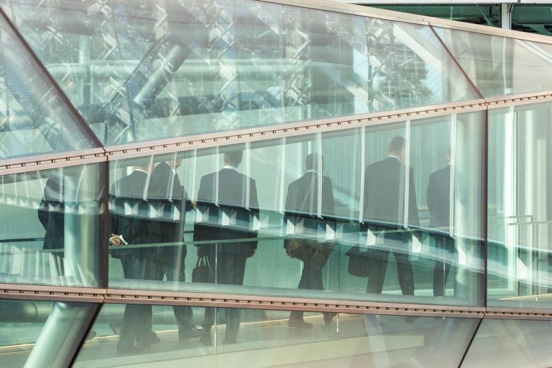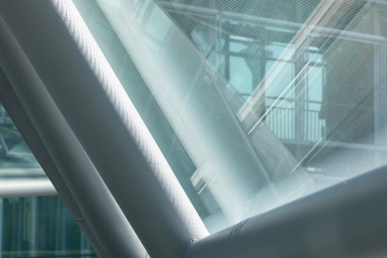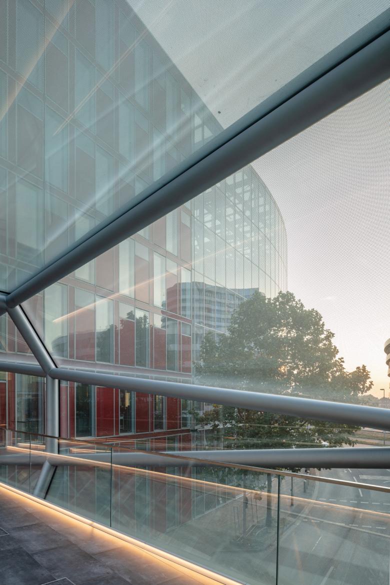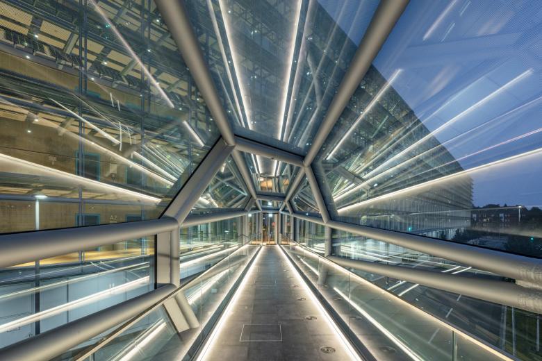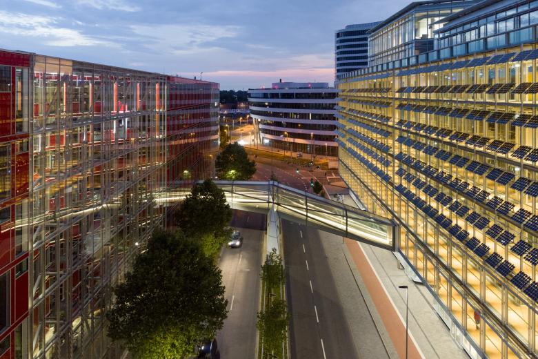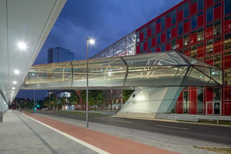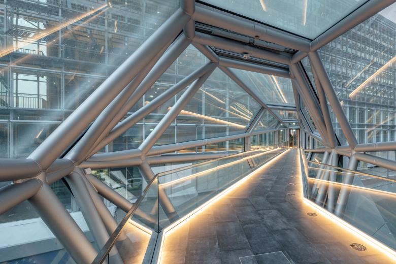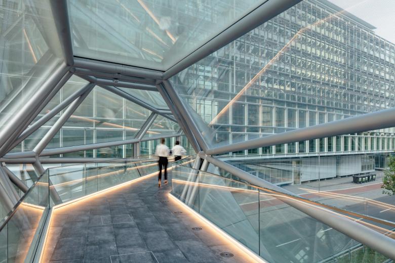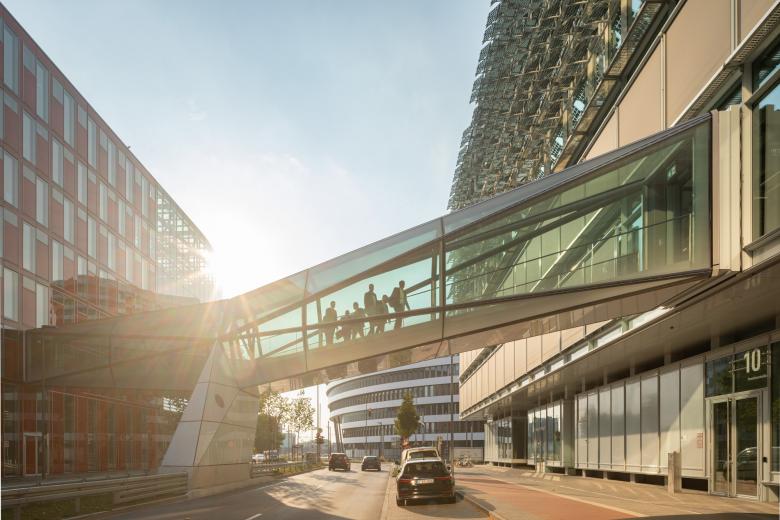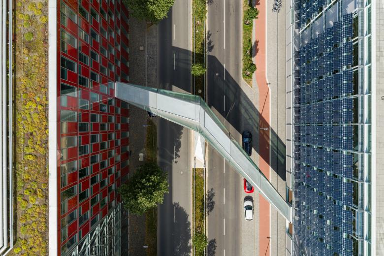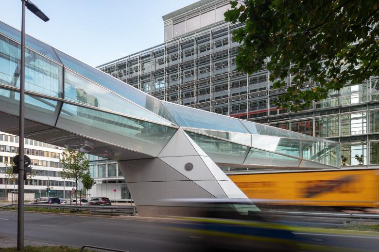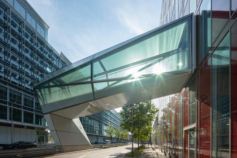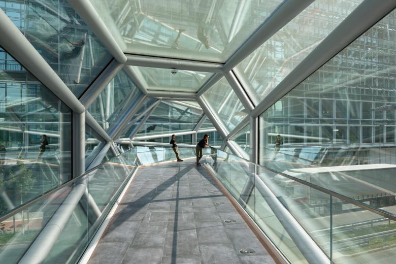 Die Glasbrücke von supergelb Architekten - auch Capricornbrücke genannt - verbindet zwei Gebäude des Uniper Headquarters im Düsseldorfer Medienhafen: das Capricornhaus von GATERMANN+SCHOSSIG und das FLOAT von Renzo Piano Building Workshop.