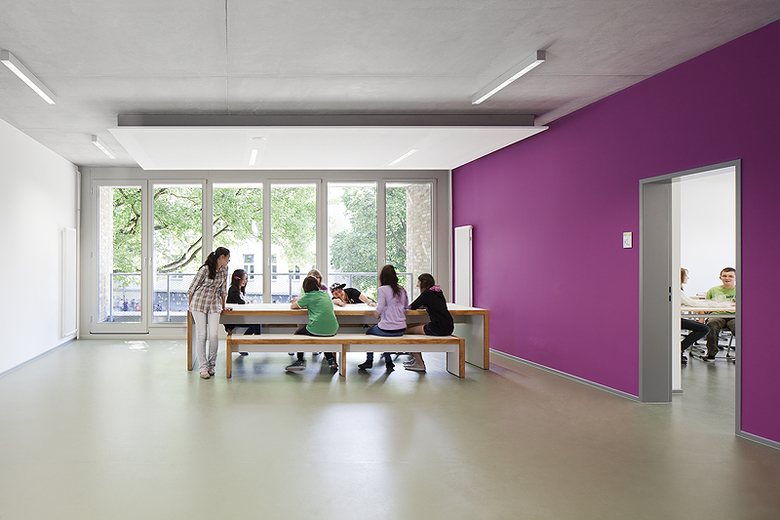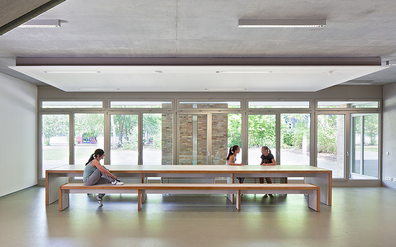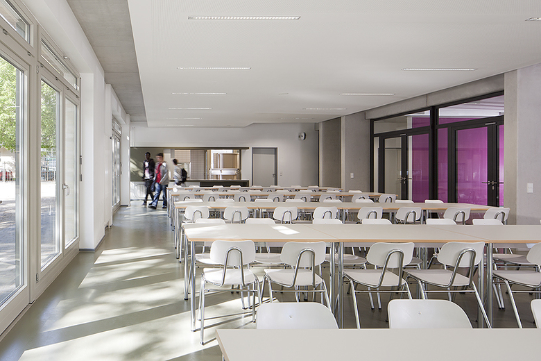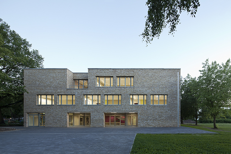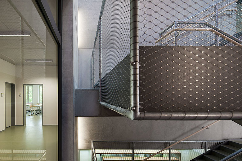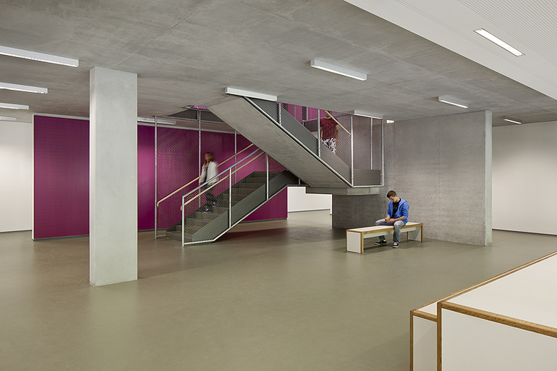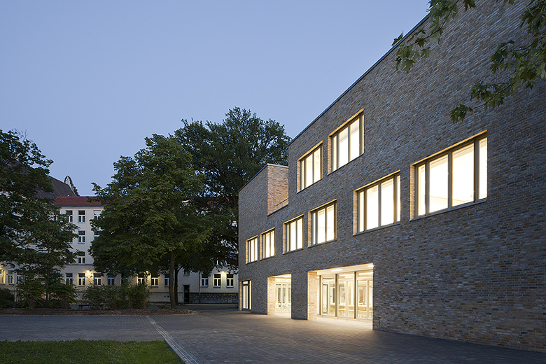 Ein dreigeschossiger Neubau nimmt das Programm der Schulerweiterung auf. Der Haupteingang orientiert sich zum Schulhof nach Osten, ein Nebeneingang für Abendveranstaltungen nach Westen zur Genfer Straße. Eine zentrale Treppe, die im EG als Freitreppe beginnt und in den beiden Obergeschossen als geschützter zentraler Treppenraum ankommt, erschließt das Haus. Ein Oberlicht sorgt hier für natürliches Licht von oben, großzügige Fenster gewähren Einblicke aus dem Treppenraum in die Flure. Diese öffnen sich zu unterschiedlichen Orten in der Umgebung: EG zum Schulhof, OG zur Eiche und im 1.OG zum bestehenden Schulhaus. Die Flurerweiterungen bilden Treffpunkte für Schüler und Lehrer. Fest eingebaute Möbel bieten Platz zum Hausaufgaben machen oder auch zum entspannten Spiel.