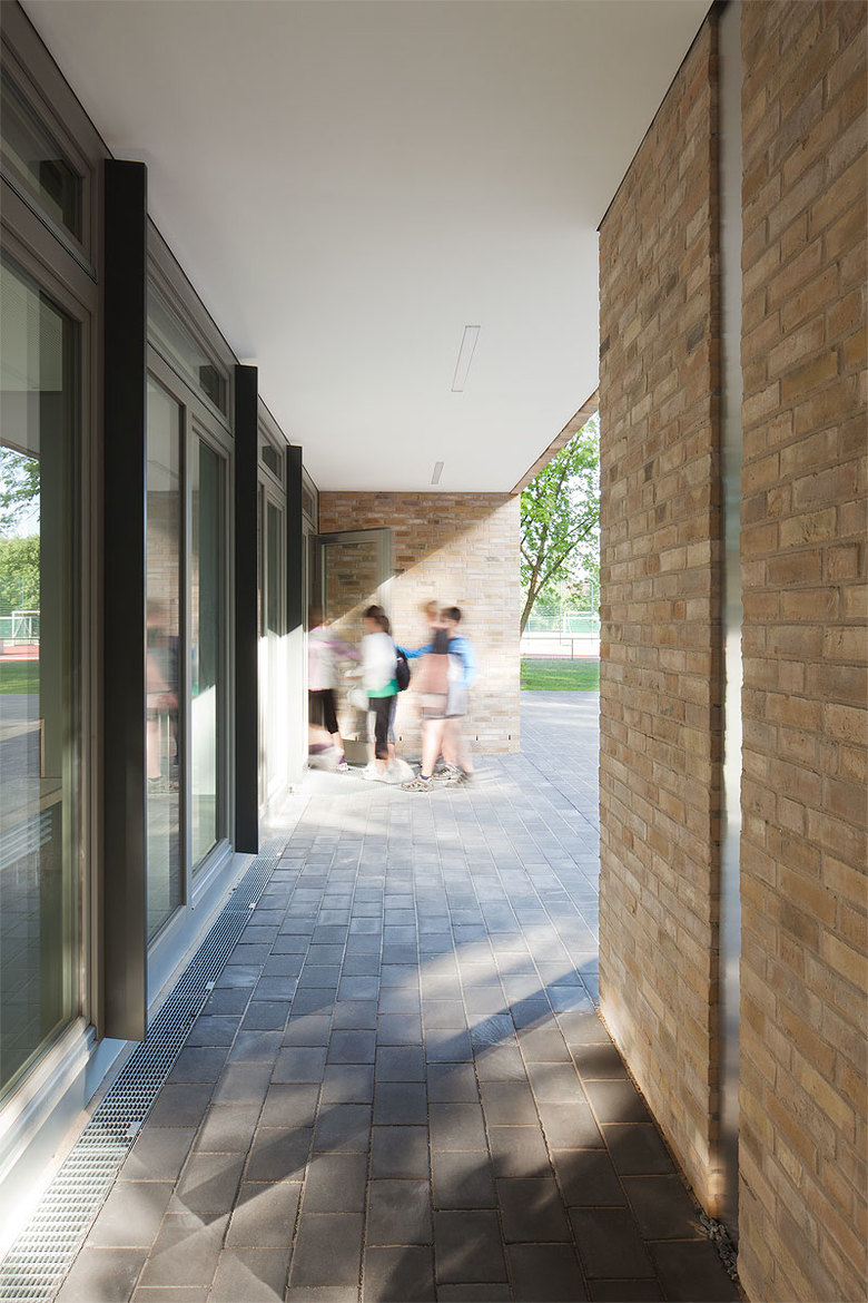 Die Außenhaut des Neubaus bildet eine Verblendung mit hellgrauen Klinkern. Dieses Material entspricht der intensiven Nutzung des Schulgebäudes und der Nähe zu den Sportflächen. Die Verblendung mit Klinkern gewährleistet den geforderten Graffitischutz.