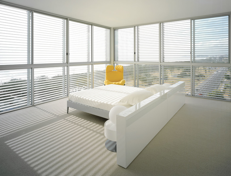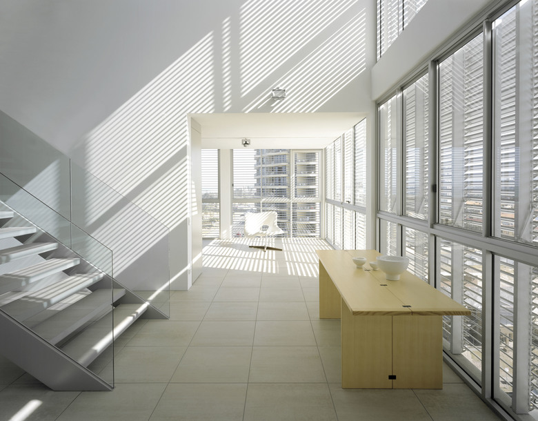 The west elevation of the satellite tower is fully glazed behind a continuous vertical sun screen of ellipsoid aluminium louvres which are motorised and individually controlled by the occupants of each unit. The western façade of the main tower is clad in yellow composite aluminium panels forming spandrels between horizontal strip glazing to the units shaded by horizontal motorised yellow aluminium louvres.