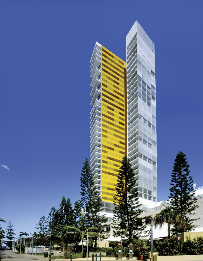 This 37 storey residential tower is located above the eastern end of the existing Oasis shopping centre at Broadbeach on Queensland’s Gold Coast. The building is centred over the existing monorail turning circle and is directly linked to the monorail station at level 3 of the shopping centre. The residential tower contains 134 apartments, a gymnasium/health club and landscaped gardens incorporating swimming pools and a tennis court on the roof of the shopping centre.