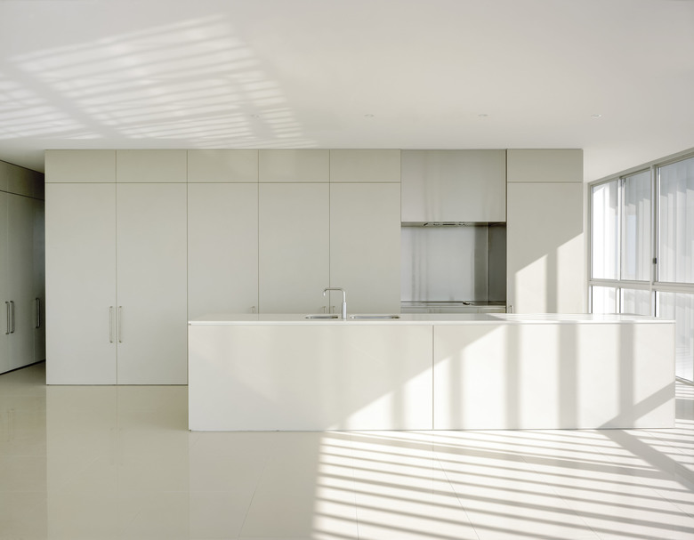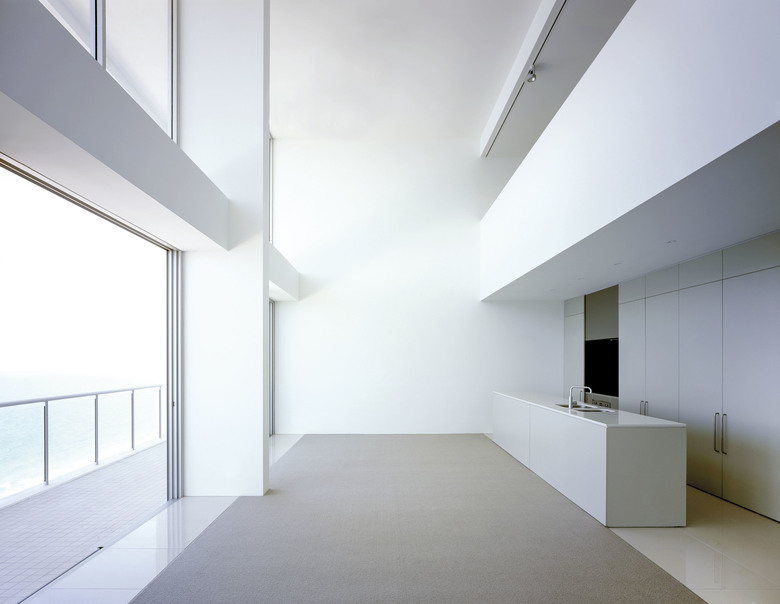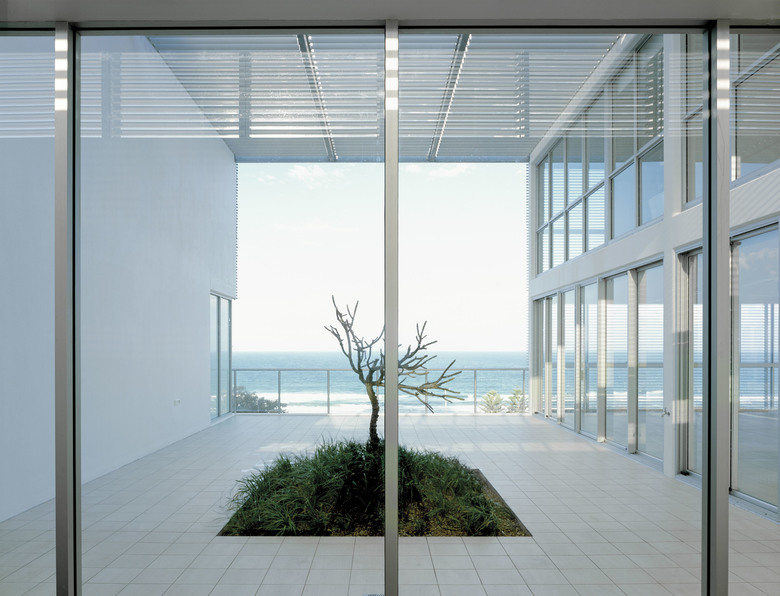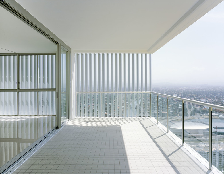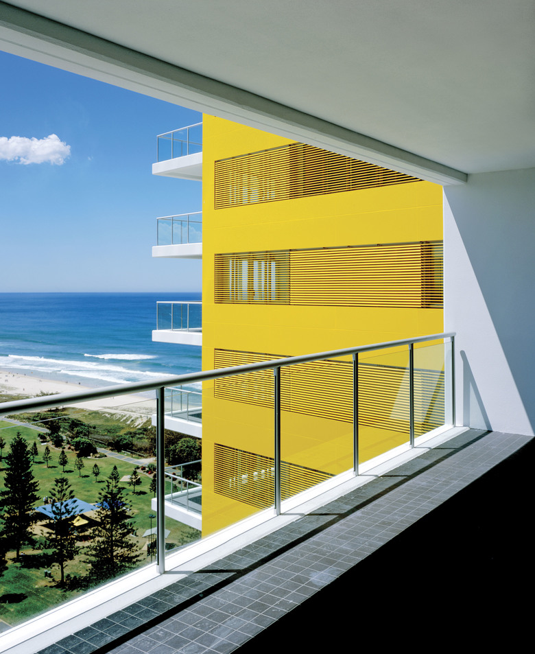 The building is clearly articulated by way of its three part horizontal and vertical elements, strong shadowlines emphasise the physical separation of the parts. All elevations are distinct but linked by a common kit of parts, with materials and finishes reflecting the different aspects of each elevation, open to the east, closed to the west, shaded to the north. The east is the largest and most heavily articulated of the elevations. This is a direct response to the desire to give all apartments access to views over the beach and the ocean, as well as producing a long slender tower only one apartment deep to allow for natural cross-ventilation. This east elevation is articulated by way of the horizontal balcony slabs and vertical blade walls between units. As the unit size and configuration change so does the elevation. Two storey high units are clearly expressed as larger voids with mezzanine balconies. The balconies provide deep modelling to this façade, acting as sunshading to the floor-to-ceiling sliding glass doors. The shadows created by this irregular grillage provide further texture and scale to the building.