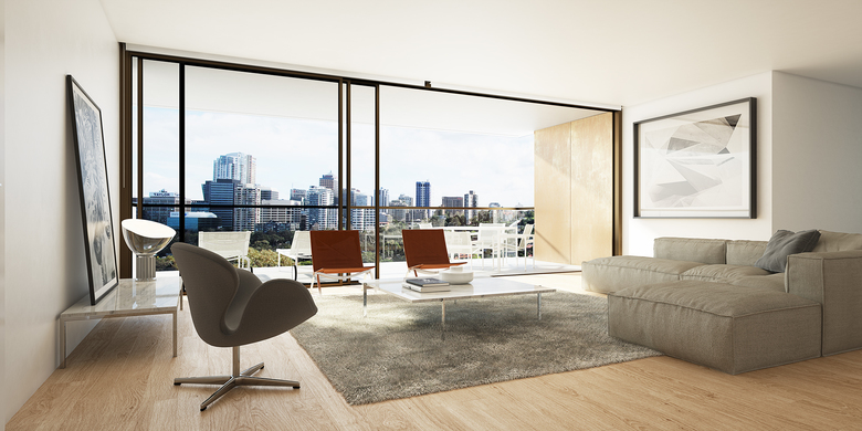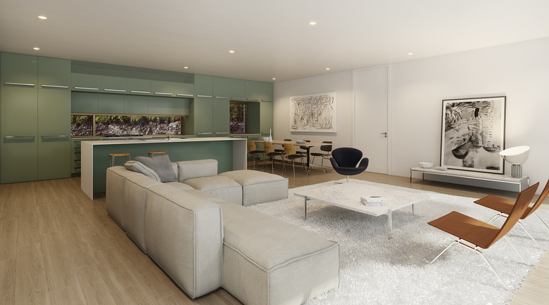 Two irregular shaped, steeply sloping sites have been amalgamated for this 13 unit residential development, however the local Council were insistent that there must be two separate buildings on the site to reflect the original development patterns in the area. The southern building has five levels, containing nine three bedroom units, with iconic views of the Sydney Harbour Bridge and CBD, while the northern building has four levels, containing four three bedroom units, with westerly views over North Sydney.