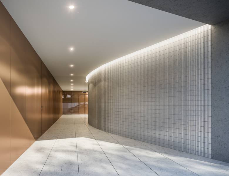 Light Bronze aluminium cladding and sun-control louvres pick up the colour tones of the rock outcrop and stone retaining wall, providing the building with a crisp silhouette against the heavily landscaped setting. This colour palette is continued on the interior with all units having European Oak flooring and, Travertine paving to terraces, bathrooms and lobbies. Bathroom walls and the curved wall of the main entry are clad in handmade Japanese finger tiles, having an irregular speckled glaze providing further texture to the interiors, contrasting with the smooth uniform finish of the exterior.