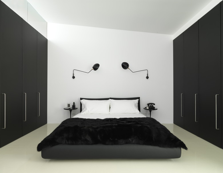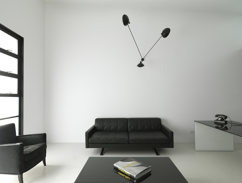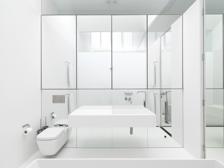 All existing structure has been retained, lined and painted white, while all new elements are painted black. This concept is carried through to the black and white rubber flooring. All joinery is finished in black anodised aluminium, including the bathroom on the upper level, which maintains the datum established by the height of the original window openings. The clear glazing above allows light from the new clerestory window to illuminate the formerly dark centre of the deep open planned space. Internally the bathroom is lined with Corian on both walls and floor.