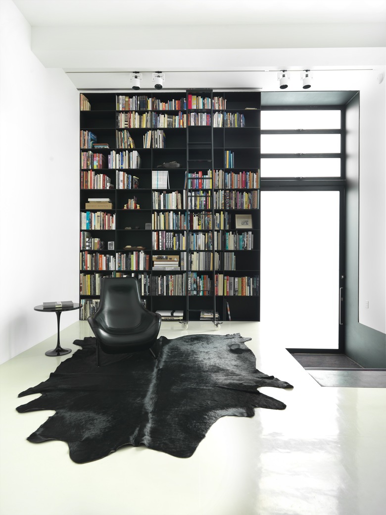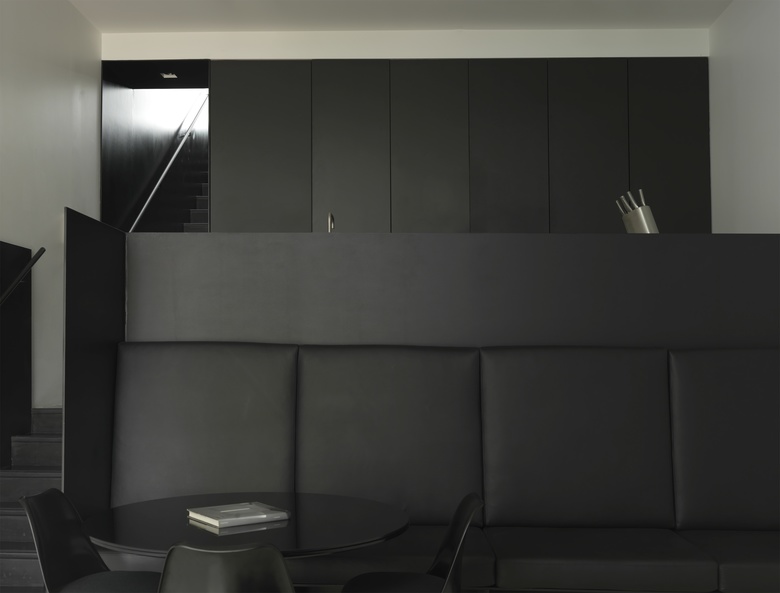 Internally a 1.7 metre height difference between the 2 streets is utilised to create the tall volume of the living space, with its’ floor to ceiling wall of books. The kitchen occupies the half level above, overlooking the living area and is screened by a black steel plate structure incorporating a built-in black leather bench seat. The garage opens off the kitchen, with its’ internal dimensions defining the major strategic move within the design. Once the guest bathroom/laundry/storage and the stair opposite were deducted from the internal width, together with the minimum width required for the garage, the remainder was 10 millimetres with which to construct the wall between the garage and stair. This led to the adoption of the 10 millimetre thick steel plate structure that flows through to the entry portals, the kitchen surround and bookcase.