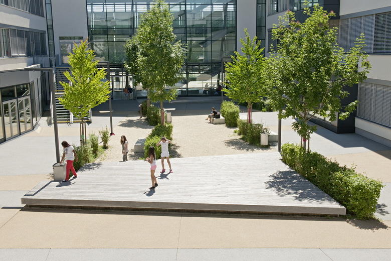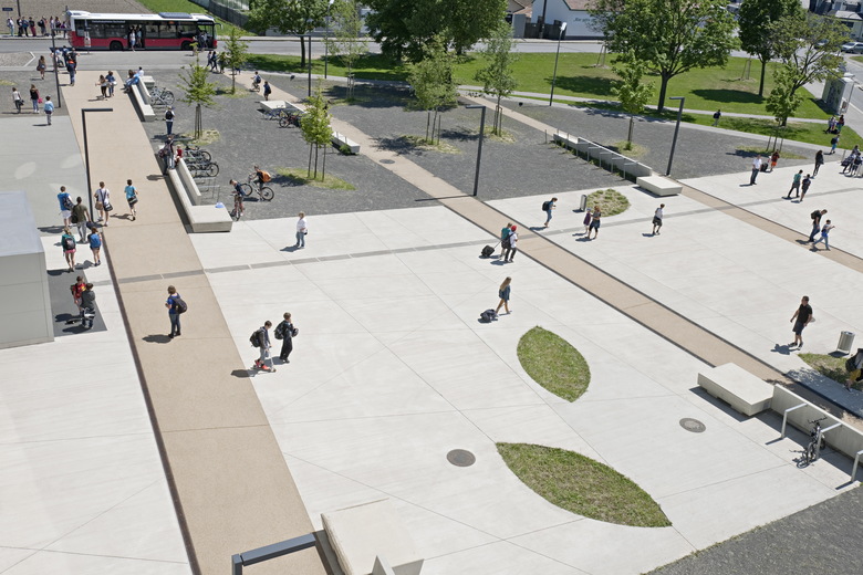 Die Schule am Contiweg orientiert sich an einer zentralen Freiraumachse. Dieser Contistreifen verbindet den lichten Hain des Vorplatz mit den differenzierten Teilräumen des Innenhofs und der Dachterrasse und führt schließlich zu den Bewegungsfeldern des Schulgartens.