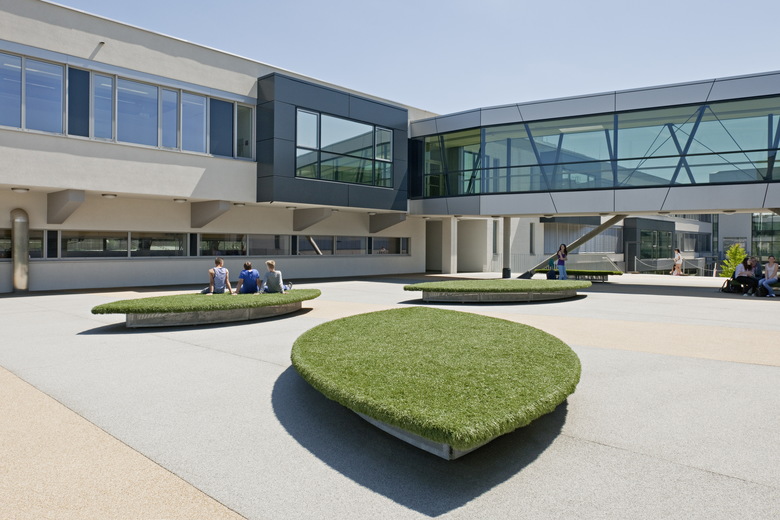 Individuell gestaltete Möbel, wie die Fahrradbank oder die Kunstrasenlinse machen den Aufenthalt für die Schüler zusätzlich reizvoll.