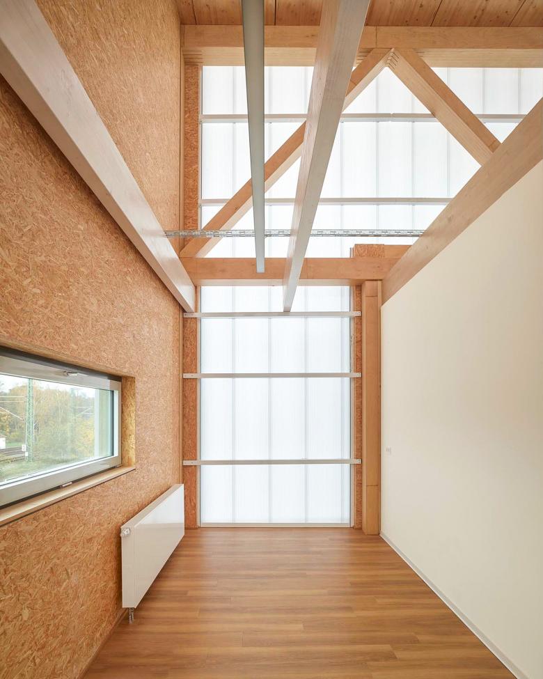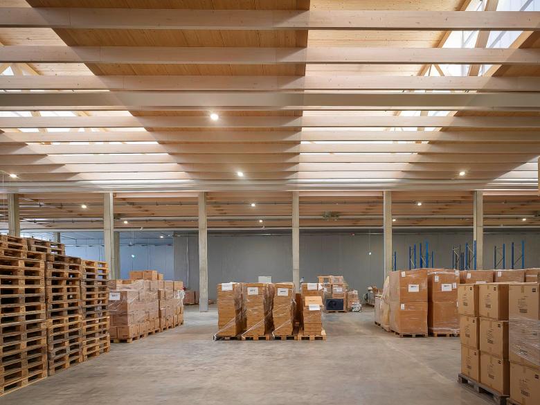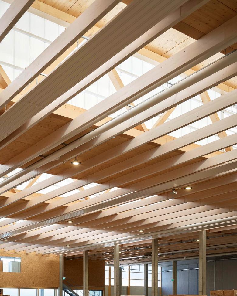 Das Holztragwerk der Logistikhalle prägt als Taktgeber den Rhythmus der Dachflächen, ähnlich eines Sheddaches, es wird dadurch die natürliche Belichtung der Logistikhalle gewährleistet. Nahezu unbehandelte Holzwerkstoffplatten und auch das sichtbare Holztragwerk innerhalb der Logistikhalle erzeugen eine sehr nahbare Atmosphäre. Das Wechselspiel von rau, unbehandelt zu glatt und bearbeiteter Oberfläche im Innenraum nimmt Bezug auf den ursprünglichen Industriecharakter des Gebäudes und Umgebung.