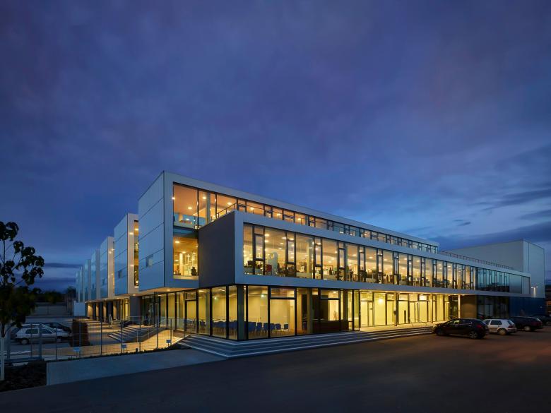 Unterschiedliche Nutzungen wie Logistik, Produktion, Lagerung und Verwaltung werden in einem Gebäude zusammengefasst ohne das die einzelnen Nutzungen von außen klar ablesbar sind. Das Erscheinungsbild ist geprägt durch eine reduzierte und geordnete Materialwahl. Hierzu zählen die transparenten Glasfassaden, die im Erdgeschoss im Bereich der geschlossenen Fassaden durch einen anthrazitfarbenen Sockel ergänzt werden, sowie die weißen Oberflächen der vorgehängten Glasfassade und Fassadenbänder.