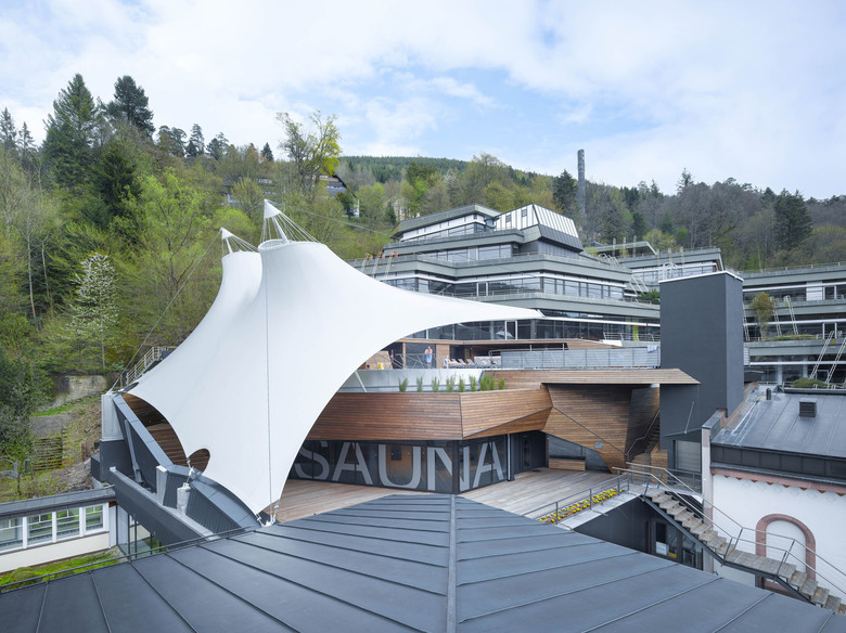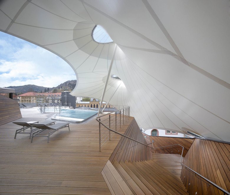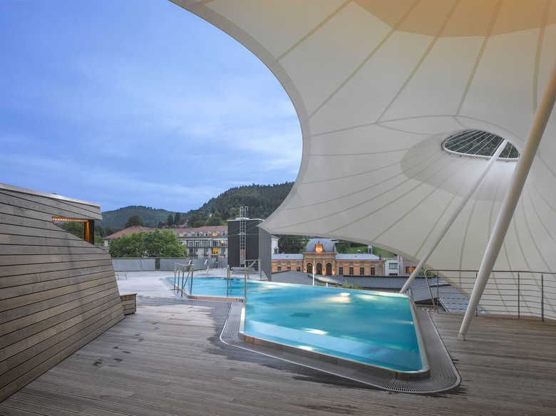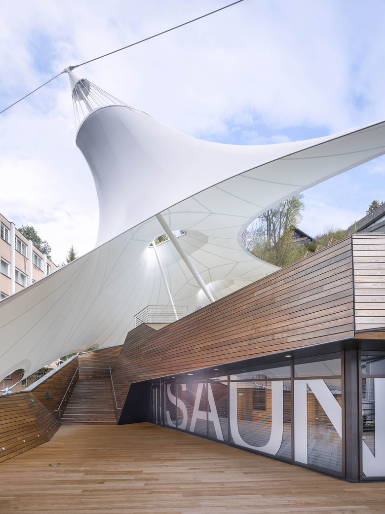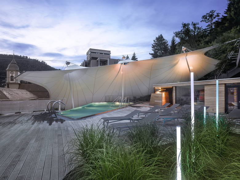 Um Einblicken des benachbarten Thermenhotels vorzubeugen, spannt sich über die gesamte Nordseite eine signifikante und leichte Membrankonstruktion. Die lichtdurchlässige weiße Membranfläche rahmt einerseits den Blick nach Süden und Osten und schafft andererseits auch Witterungsschutz auf weiten Bereichen der Holzdecks. Zusätzlich wirkt die segelgleiche temporäre Installation, die abends auch beleuchtet erscheint, atmosphärisch und ist durch das Zusammenspiel mit den Holzflächen von allen Seiten aus weithin sichtbar.