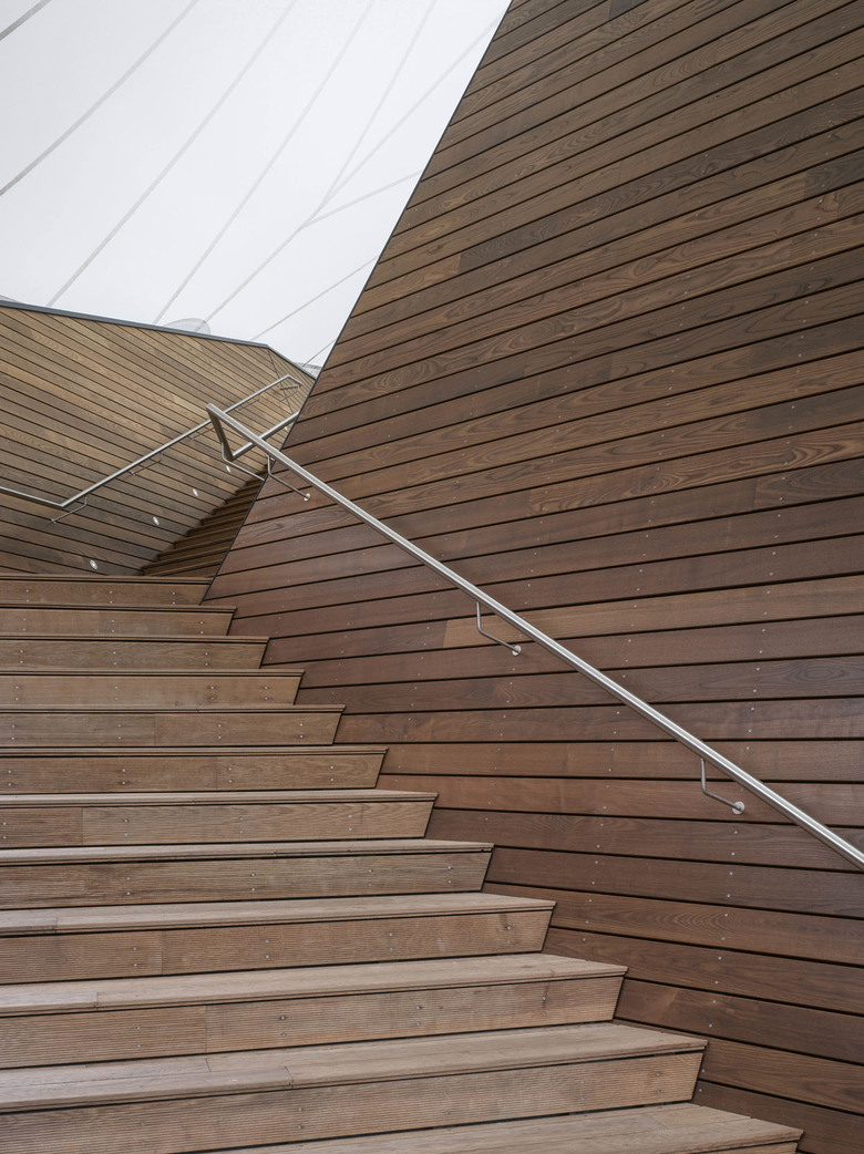 Die einheitliche und räumlich spannungsvolle Faltung der hölzernen Oberflächen wurde im Vorfeld simuliert und durch eine Holzunterkonstruktion vor Ort nahezu maßgenau und im Detail handwerklich anspruchsvoll umgesetzt. Die Wandoberflächen sind aus Thermo-Ulme und die begehbare Terrassenflächen ergänzend hierzu aus Thermo-Esche.