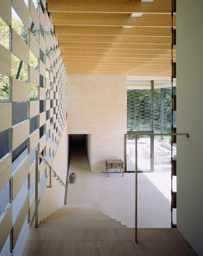 壁面もまた無数の穴としてデザインされている。石という重量感のある素材を用いながら、風の吹き抜けるような軽やかな壁面を作りたいと考えた。「穴」が無数に空いた限りなく薄い石の壁を作りたいと考えた.石で出来ているのに和紙で出来た障子のような薄さ、軽やかさが感じられるような壁面を目指した。具体的には20cmx60cm、厚さ30mmの薄いトラバーチンの板を8x16mmのフラットバーに吊るし、チェッカーボード状のポーラスなパターンを構成するディテールとした。石の質感をいかした、軽くポーラスな壁面は「石の博物館」(2000)で一度試みた。今回はステンレスパイプを併用する事でさらに薄くさらに軽いディテールが可能となった。