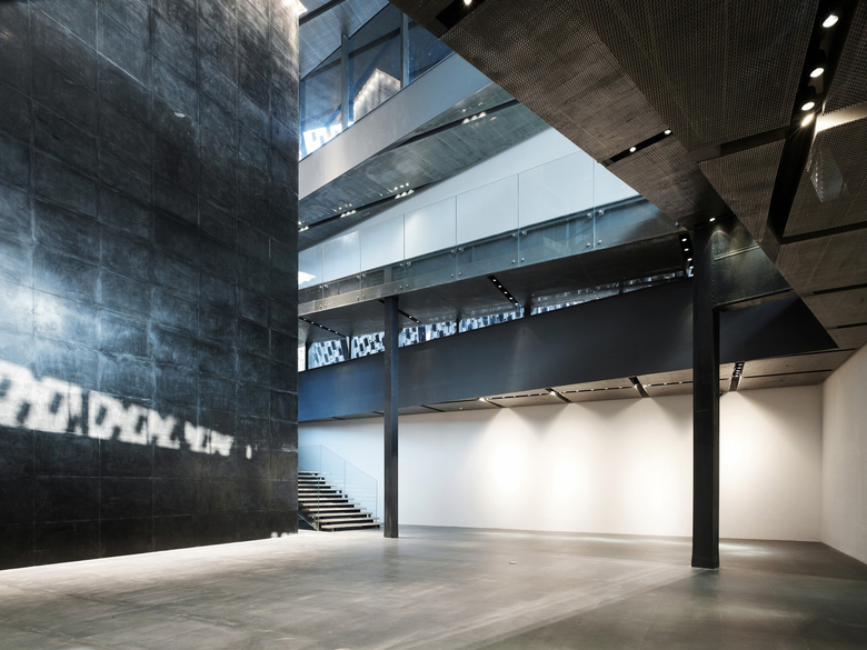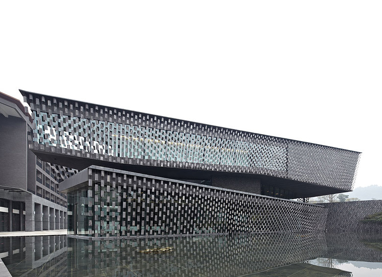 道教の聖地、新津老君山の麓にある当芸術館。ファサードでは瓦を使う。かわらは当地の素材を、地元の工場で伝統工法で作られるもので、自然、均衡を重んじる道教に敬意を払っている。同時に、それをワイヤーで吊るし、浮かばせることで、瓦はそれがもつ重さから開放され、軽快さを獲得する。建築は粒子からなる呼吸するファサードをまとい、周りの自然と溶け合う。建築内部は、暗から明へと導くらせん状の展示空間からなっている。上層の展示スペースからは、老君山の雄大な風景を望むことができる。直射日光は瓦にさえぎられる。建築内部は柔らかなひかりで包まれ、魅力的な粒子状の影ができる。