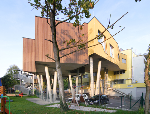 Inspiriert durch die Lage des Grundstückes zum Park hin und dem bestehenden Baumbestand, wurde gemeinsam mit der Bauherrschaft die Idee zum Baumhaus geboren - der Traum eines jeden Kindes. Um Begeisterung und Visionen in Kindern zu wecken, brauchen sie einen besonderen Ort. Die Gruppen- und Bewegungsräume in luftiger Höhe werden von unrhythmisch, schräg positionierten Stahlstützen, sprich Baumstämmen getragen.
