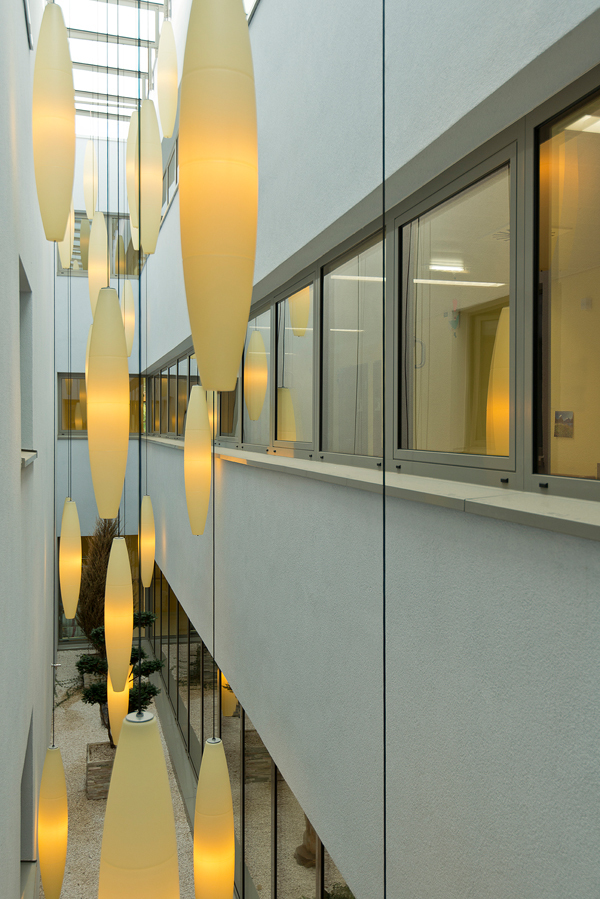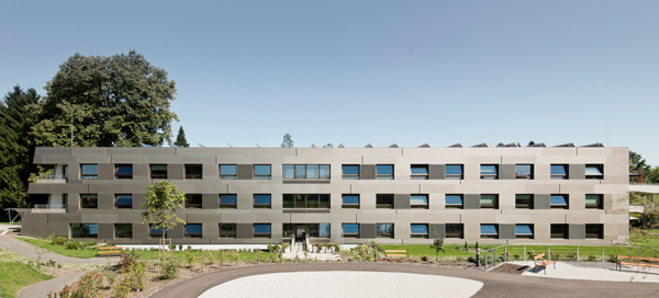 Der in die Böschung integrierte Therapiegarten ist von jedem Pflegegeschoss barrierefrei erreichbar und dient auch als direkter Fluchtweg ins Freie. Der durch Böschung und Bauwerk geschützte Garten gestattet einen überwachbaren Bewegungsauslauf für demente Patienten.