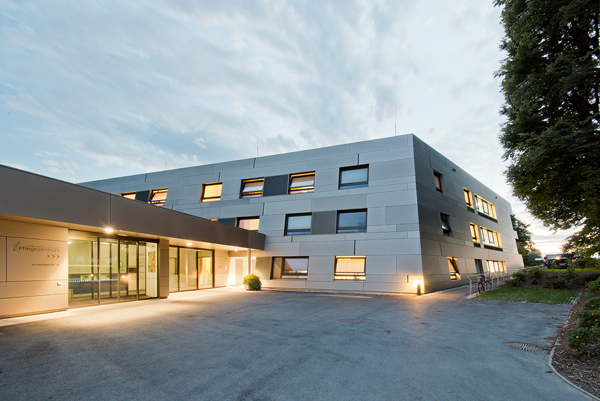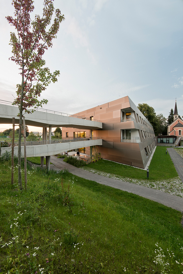 Das Hauptgebäude (extensiv begrünt) entwickelt sich aus dem Schallschutzhügel heraus und schmiegt sich gleichsam an die Umgebungsnatur an. Wird der Haupttrakt mit einer Metallfassade ummantelt, so fungiert der Verbindungsgang zwischen Bestand und Neubau, welcher ebenfalls extensiv begrünt wird, als Fortsetzung des Grünstreifens zwischen den Gebäuden. Das Motto bleibt: Die Landschaft wird zum Bauwerk.