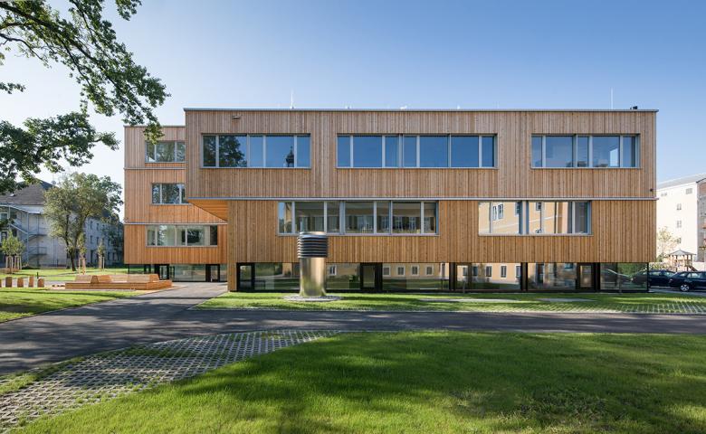 Die zwei aufgesetzten Volumen werden mit natürlich vergrauten vertikalen Holzlatten eingekleidet. Durch unterschiedlich breite und tiefe Holzlatten wird die Fassade lebendig und fügt sich in ihrer Leichtigkeit in die Parklandschaft mit den alten Bäumen ein. Die liegenden Fensterformate betonen die Horizontalität der Körper und lassen einen großzügigen Blick in den Park zu.