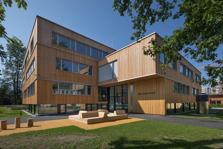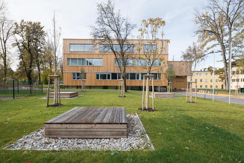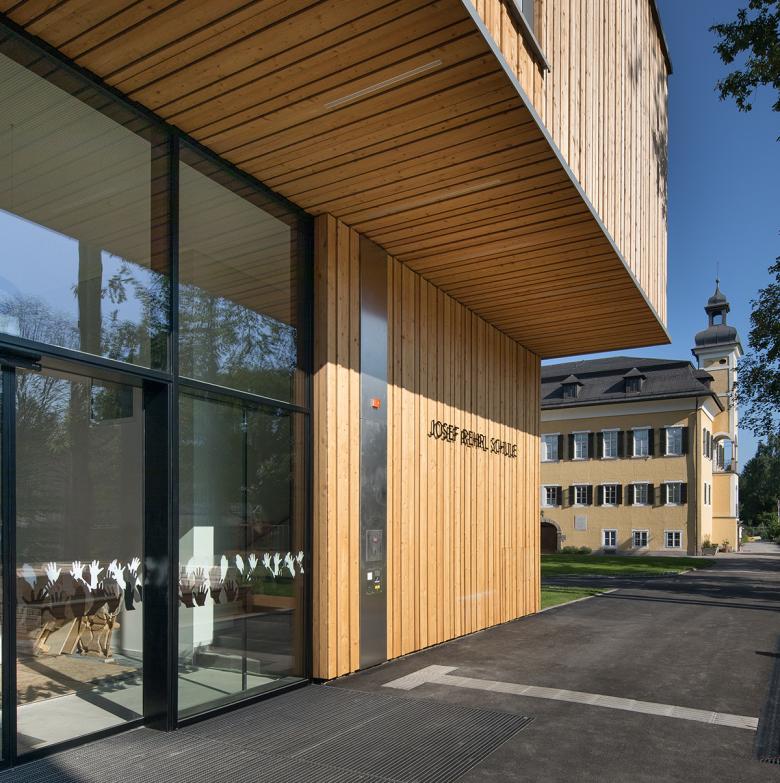 Das neue Schulgebäude sitzt als gänzlicher Neubau an derselben Stelle wie die alte Schule. Auf diese Weise konnte der Baumbestand so weit wie möglich erhalten bleiben. Der Park fließt als zusammenhängende Grünfläche uneingeschränkt vor dem Schulhaus durch. Die bestehende Struktur mit dem Schlössl und dem Internat, sowie der Tischlerei wird in seiner Konstellation mit den dazwischenliegenden Plätzen erhalten. Der Neubau ist in zwei unterschiedlich hohe Würfel gegliedert, die ineinander verwoben sind, wodurch das Gebäude weniger voluminös wirkt. Durch die abfallende Höhe zum bestehenden Schlössl hin, wird diesem gebührend Raum gewährt.