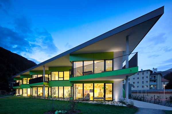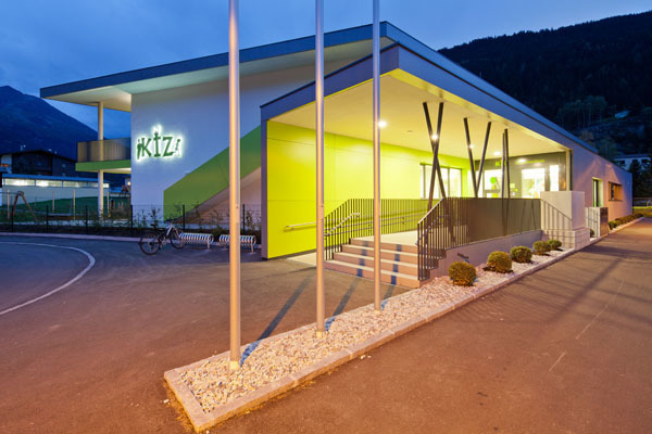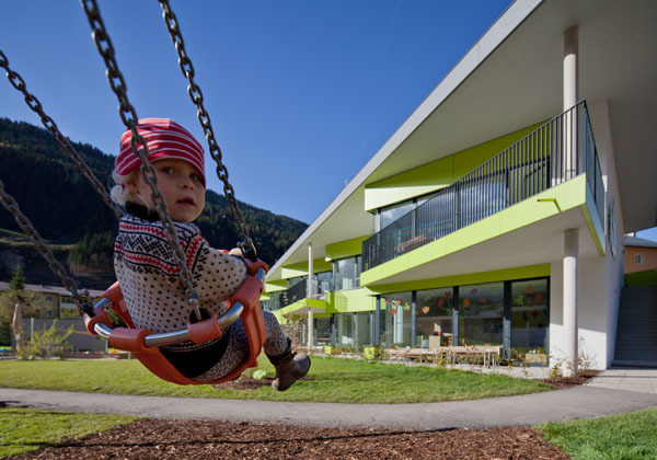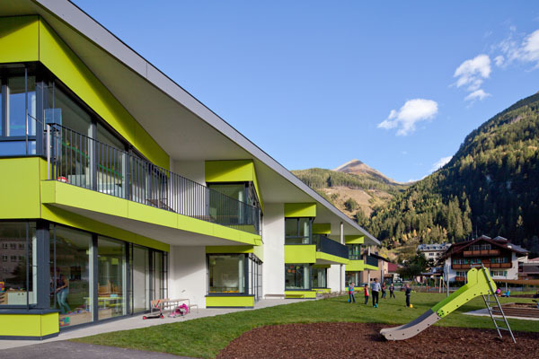 Der 2-geschossige Baukörper des neuen Kinderzentrums in Bad Gastein fügt sich durch seine Maflstäblichkeit und die schlichte, rhombusartige Form dezent in die Umgebung ein. Von einem kleinen Vorplatz am Zimburgweg, auf dem die erforderlichen Stellplätze für die Eltern sowie die Vorfahrt des Kindergartenbusses untergebracht sind, führt eine kinderwagentaugliche, überdeckte Vordachzone die Besucher zentral ins Gebäude, wobei die Kinder als Besonderheit eine eigene, kleinere Eingangstüre erhalten haben.