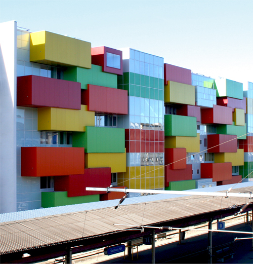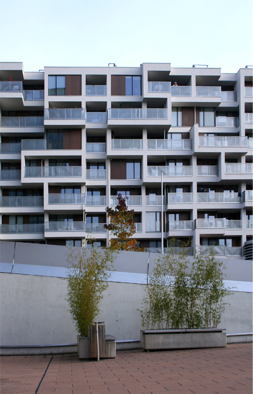 Die barriereartige Bebauung entlang der Eisenbahn schützt den Bauplatz vor den Bahnemmissionen. Die darin befindlichen Wohnungen orientieren sich ausschließlich zum Park. Die bahnzugewandte Seite spiegelt in ihrer Fassade das Motiv eines Wagenstandanzeigers der Bahn wider. Die containerartigen Einheiten ersetzen die sonst im Keller üblichen räumlichen Funktionen, wie Fahrradabstellplätze, Wasch- und Trockenräume und Abstellräume. Zwei Panoramafenster im obersten Geschoss eröffnen den Blick aus den Aufenthaltsräumen über die Bahngleise hinweg Richtung Schallmoos.