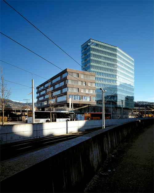 Das schlanke GKK-Hochhaus im Bahnhofsareal bleibt mit 47 m Höhe deutlich unter der Höhe der benachbarten Hochhäuser der „Zyla-Türme“ und dem Hotel Europa mit 62 m Höhe. Er steht weitgehend solitär zwischen Straße und Grünraum.