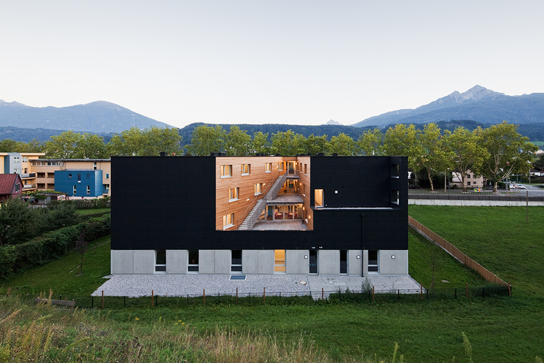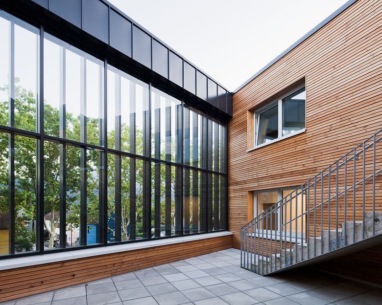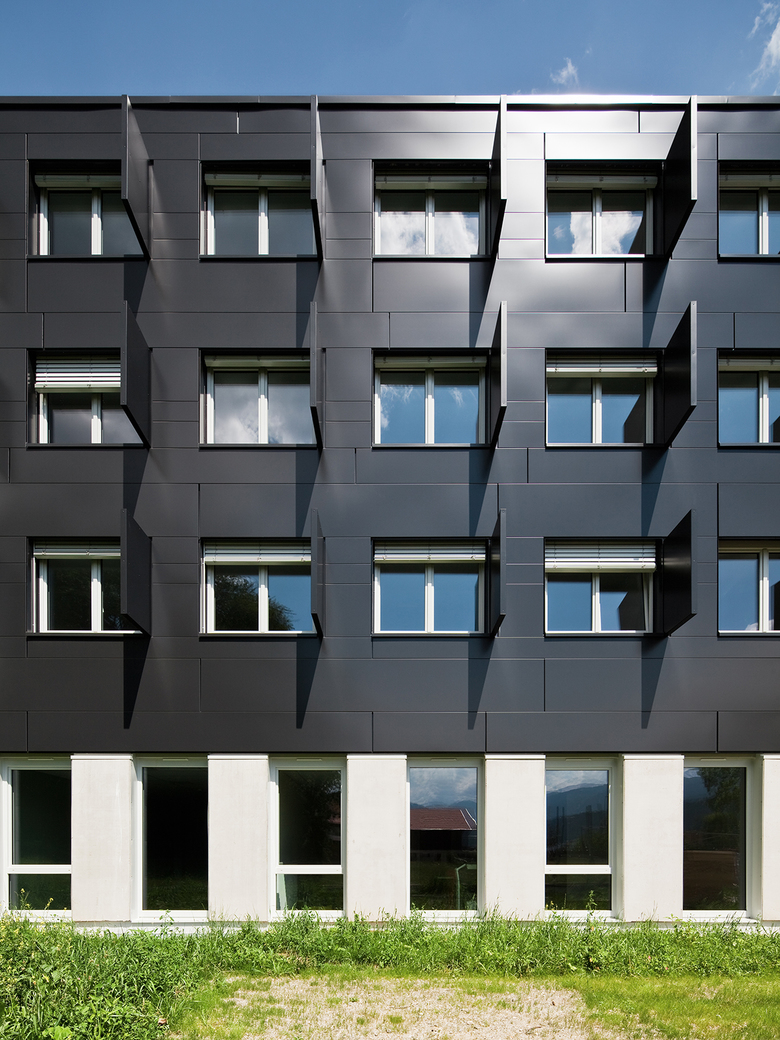 Die schwarze Metallfassade lässt das Bauwerk zurückhaltend wirken, nur das Fugenbild spielt mit unterschiedlichen Höhen und Breiten der einzelnen Fassadenelemente und lockert das sonst streng gerasterte Lochbild der Fensteröffnungen auf. Durch 90° abstehende, fixe Fensterläden, die dem Schallschutz dienen, erfährt die Gebäudehülle eine weitere dreidimensionale Komponente. An der Südfassade schirmt eine Verglasung den Innenhof vom Straßenlärm ab – die vorgesetzten Vertikallamellen schließen optisch die Fassade, lassen jedoch viel Licht auf die entstehenden Freiflächen durch.