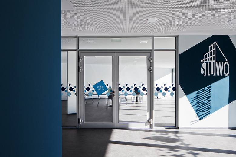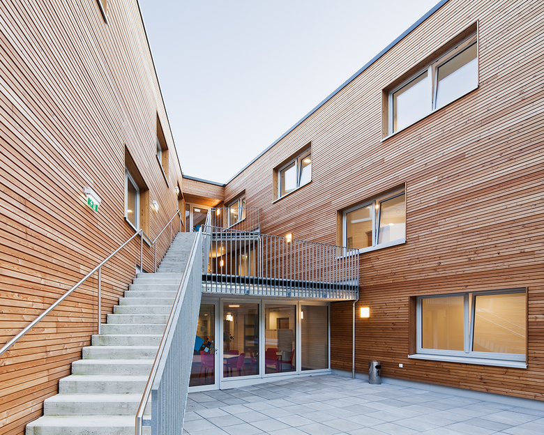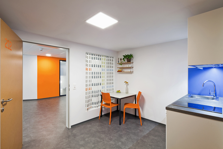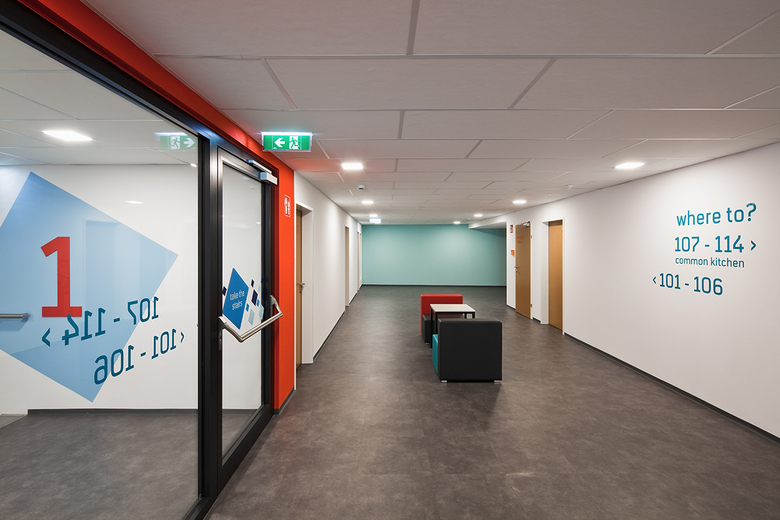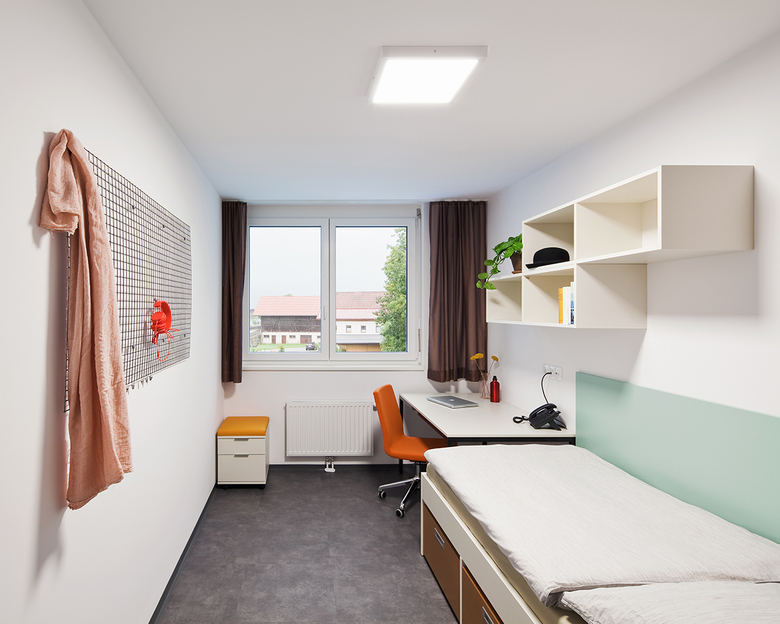 Alle öffentlichen Funktionen des Studentenheims sind im Erdgeschoß organisiert – somit deutlich getrennt von den Studentenzimmern in den oberen 3 Geschoßen. Die Zimmer orientieren sich nach Osten und nach Westen und werden über einen innenliegenden, zentralen Flurbereich erschlossen, der sich nach vorne und nach hinten zur Landschaft hin öffnet und jeweils einen Innenhof entstehen lässt. Die innere Struktur gliedert sich in die zentrale Begegnungsfläche, gefolgt von den halbprivaten Vorräumen der Appartements und den privaten Einzelzimmern der Studenten, die sich nach außen orientieren. Diese offene Gestaltung ermöglicht den Studenten viel Raum für soziale Begegnungen.
