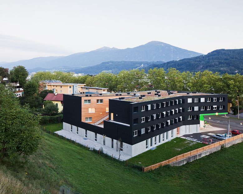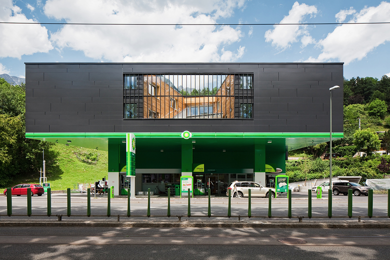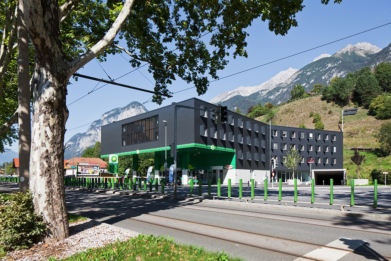 Auf dem Grundstück der bestehenden BP Tankstelle an der Westeinfahrt von Innsbruck wird dem markanten Neubau zusätzlich eine studentische Nutzung zugeführt. Der Entwurf sieht eine charmante Überbauung der Tankstelle vor, in der Wohnraum für 85 Studierende geschaffen wird. Das auskragende Tankstellendach mit seiner expressiven Aufweitung zur Straße hin, ist bereits von weitem sichtbar und leitet den Kunden einladend unter sein grünes Dach. Die Nutzungserweiterung dieses Ortes durch ein 4-geschossiges Studentenheim, welches sich behutsam von hinten an die Tankstelle annähert und diese letztendlich überdeckt, lässt ein spannendes Gebäude entstehen.