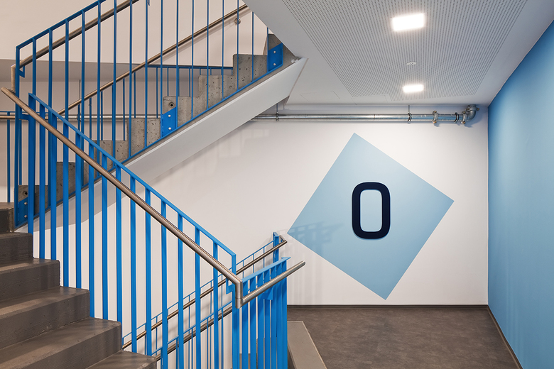Das Gebäude ist in Stahlbeton mit einer hinterlüfteten, harten Metallfassade in den oberen Geschossen konzipiert. Die Erdgeschoßzone bekleiden Fertigbetonelemente. Die Innenhöfe wurden an den Wänden mit einer Holzlattung beplankt und stellen den introvertierten Gegenpol zur homogenen Metallfassade dar. Das Dach ist als extensiv begrüntes Warmdach ausgeführt.