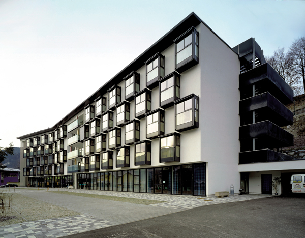 In der Ansicht wirkt die Fassade wie ein Schachbrettmuster, erst in der Perspektive heben sich die Erker hervor, wirken aber durch ihre Regelmäßigkeit und Farbigkeit sehr homogen. So wie sie das Seniorenheim zu ihrer Vorder- und Rückseite prägen, so sehr sprechen sie sich für die Bewohner als geschützten Balkonersatz und als Sitznische aus.
