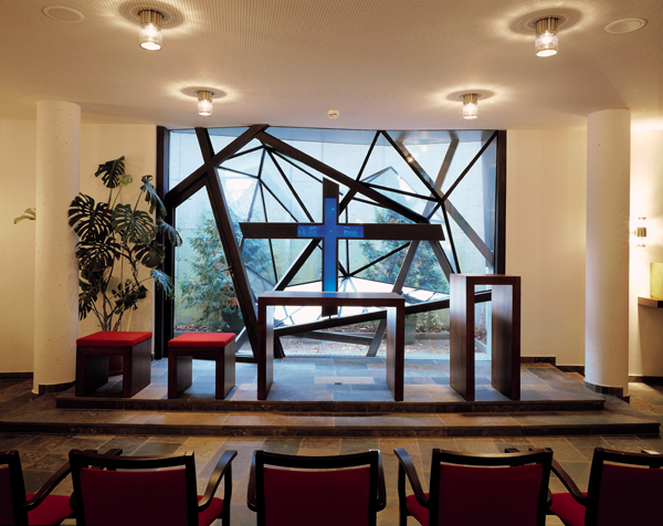 Der geistliche Treffpunkt eines jeden Seniorenheims ist die Kapelle, welche in diesem Fall in Zusammenarbeit mit Heri & Salli, einem bekannten Architekturduo aus Wien entstand.
