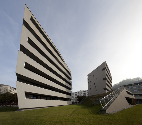 Die Innenzone ergibt ein ruhig gelegenes Ensemble mehrstöckiger Gebäude, die den Eindruck erwecken, als handle es sich hierbei um losgelöste Felsbrocken vom Kapuzinerberg. Die Großzügigkeit der Freiraumflächen wirkt sich auf die Höhe der Bauteile aus, wobei alle Wohnungen gleichwertig nach Südwest ausgerichtet sind und über tiefe Balkone über die gesamte Wohnungslänge verfügen.
