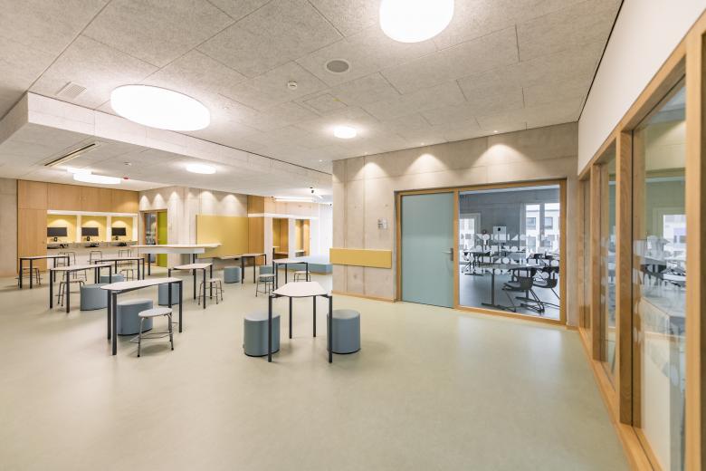 Das Gebäudeensemble gewährleistet nach der Generalsanierung eine komplette barrierefreie Erschließung. Die neue, einladende Eingangssituation mit einer lichtdurchlässigen Pausenhalle und großen Sitzstufenanlage liegt zwischen dem Neu- und Altbau. Der Neubau ist als länglicher Baukörper entlang der Grenze zur Mädchenrealschule mit vorgehängten Fluchtbalkonen im Bereich der Lernlandschaften gestaltet. Diese stehen den Unterstufen zur Verfügung und sind auf drei Geschosse aufgeteilt.