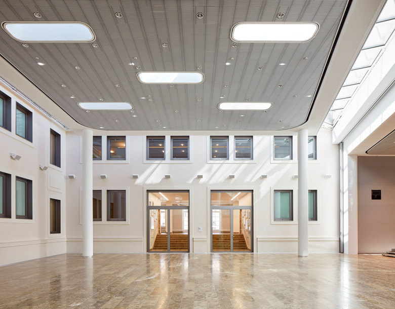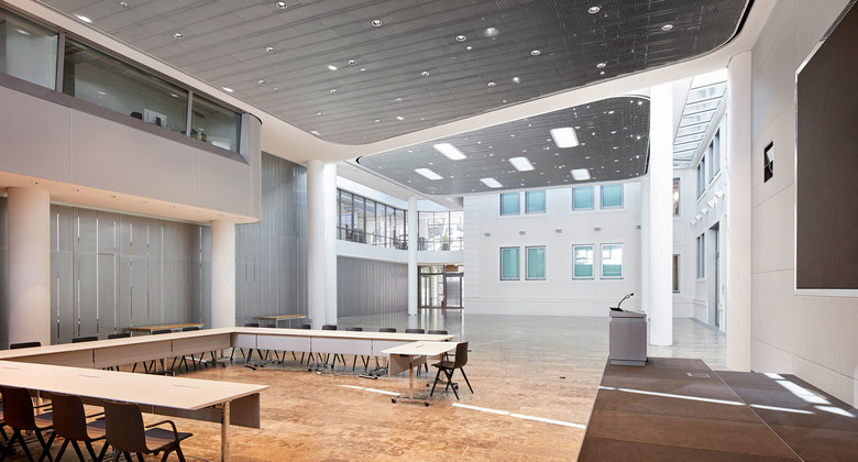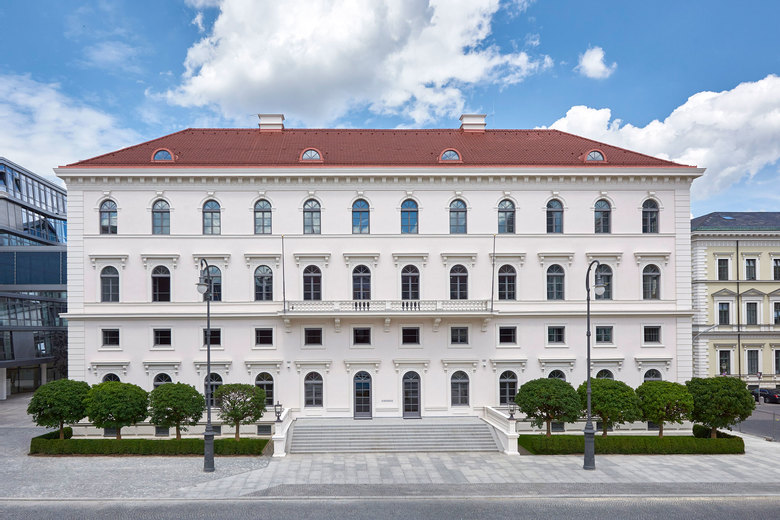 Ein wesentlicher Aspekt bei der Neugestaltung war dabei die Integration des denkmalgeschützten Palais Ludwig Ferdinand in den Neubau. So ist die restaurierte Außenfassade Teil des im Inneren neu entstandenen Auditoriums. Trennbar mit Schiebeelementen und Vorhängen bietet dieser Konferenzbereich das angemessene Setting für Veranstaltungen verschiedener Formate – von kleinen Konferenzen bis Vortragsveranstaltungen. Hocheffiziente Medientechnik sowie Licht und Raumklima sind unsichtbar integriert in die abgesetzte Decke mit schmalen Lamellen. Die akustischen Paneele setzen die silberne Wandvertäfelung mit unterschiedlich gesetzten Lisenen in Farbigkeit und Struktur fort. Der durchgehende Natursteinboden unterstreicht neben den großzügigen Glasflächen den fließenden Charakter des Erdgeschosses. Das Mitarbeiterrestaurant und das Café im Atrium spiegeln die offene, einladende Atmosphäre ebenso wieder. Funktional aber zugleich dekorativ, zonieren die Einbauten und Bodenbeläge den Raum und schaffen unterschiedliche Platzangebote.