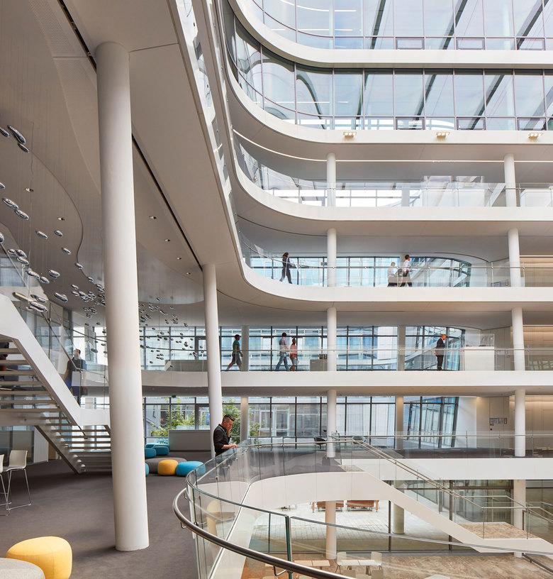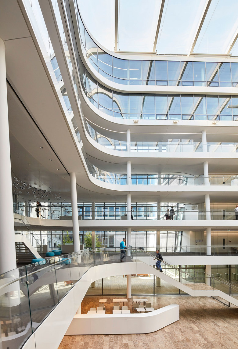 Der Neubau setzt auf ein modernes und flexibles Arbeitsumfeld für bis zu 1.200 Mitarbeiter der Konzernzentrale. Dazu gehören helle, Licht durchflutete Büros, die die Kommunikation und Teamarbeit fördern, ebenso wie eine Vielzahl an Besprechungs- und Konferenzräumen mit moderner technischer Ausstattung. Die Innenarchitektur für die offenen Kommunikationszonen entlang der zentralen Erschließungsachse, die alle Abteilungen miteinander verbindet, setzt das Konzept von Offenheit und Transparenz fort. Anstelle kleinteiliger Zonen ermöglicht die offene Struktur vielfältige Ein- und Ausblicke – zwischen verschiedenen Bürobereichen und Abteilungen. Eigens entworfene, den Teeküchen zugeordnete Tresen und Elemente reagieren auf die Rundungen und Schrägen der Glasfassaden. Lockere Sitzgruppen, Loungemöbel und interne Konferenzbereiche schaffen die Balance zwischen Kommunikation und Konzentration. Lichtelemente unterstützen die Raumwirkung der zum Teil zweigeschossigen Flächen zwischen den Ebenen.