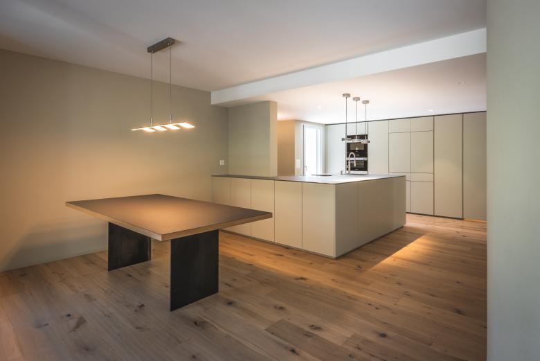 Im Innern entstanden durch wenige, gezielte Grundrissanpassungen fliessende, grosszügig erscheinende Räume. Ein Höhepunkt im Erdgeschosses des Hauses ist der Betonbank im Wohnraum und die Stahlverkleidung des Cheminées. Die privaten Räume im Obergeschoss dienen zum Arbeiten, Schlafen, Spielen und Erholen. Der bis anhin ungenutzte Balkon im Obergschoss wird zum Aussenruheraum der Sauna, die geschickt ins Bad integriert ist. Das eher kleine Kinderzimmer wird erweitert durch eine private Aussenspielfläche auf dem zweiten Balkon.